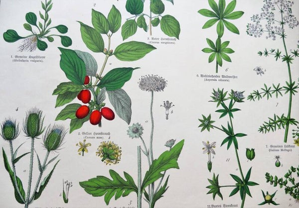 Prachtige oude lithografische prent van planten nr VII met onder andere meekrap en gele kornoelje