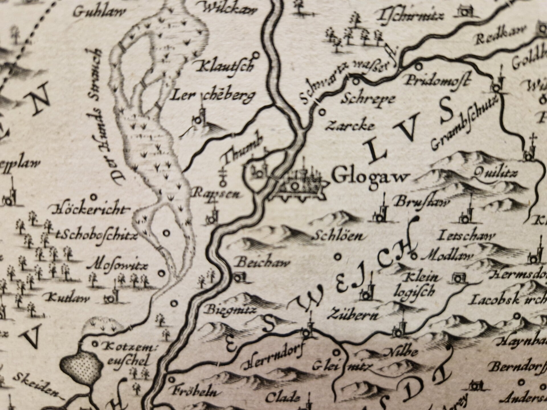 Een kaart van een stuk van polen. De kaart is ongekleurt en in een redelijke conditiie en gemaakt in 1659. De verso heeft heeft een beschrijving in Latijn.