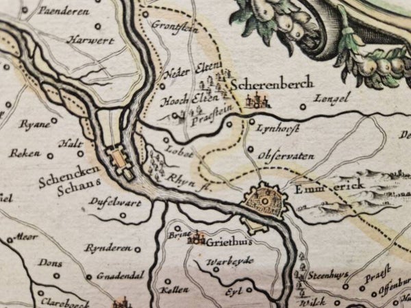 Mooie licht gekleurde kaart van het hertogdom Kleef en Ravenstein.Een deel van Brabant en Duitsland met daarin de steden Nijmegen, Venlo, Kleef en Emmerick. De kaart is gemaakt in 1635.