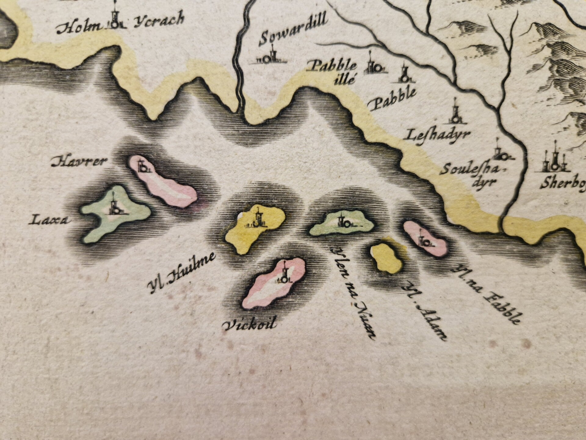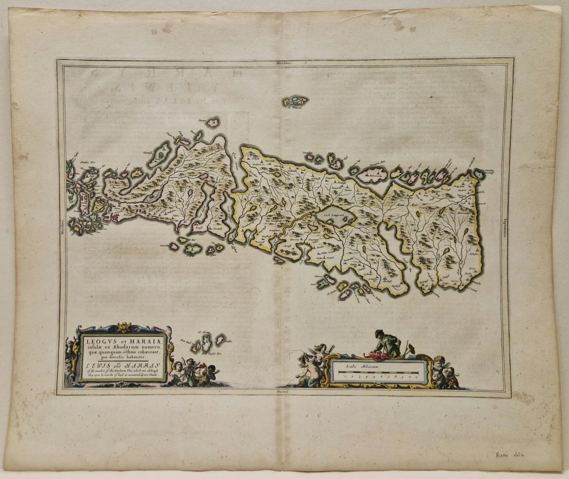 Deze kaart beschrijft de eilanden Lewis en Harray die horen bij Schotland. De kaart is licht gekleurt en in goede staat. De kaart komt uit J.Bleaus Grooten Atlas