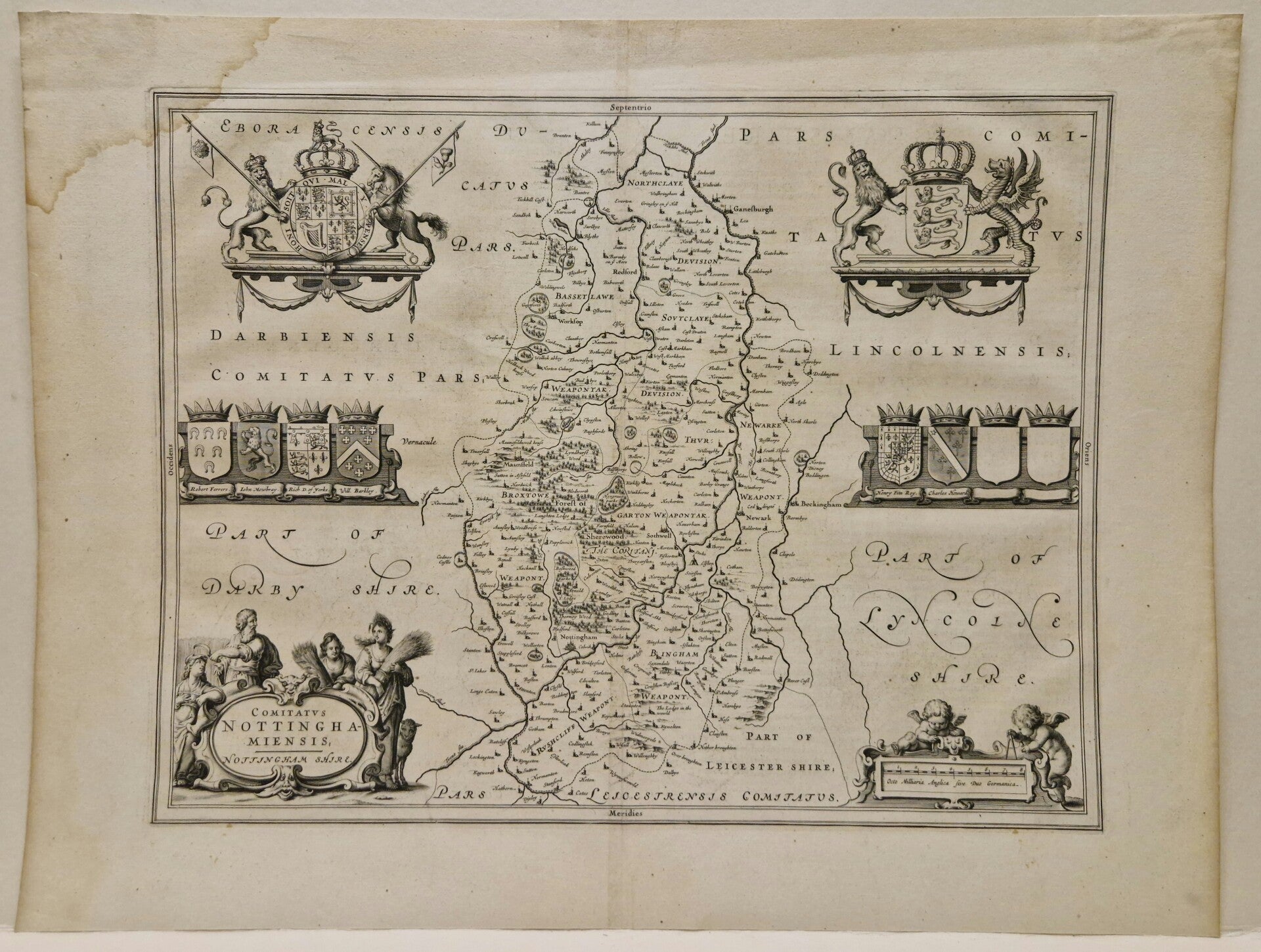 Deze mooie kaart van Nottingham shire uit Le Theatre du Monde ou Nouvel Atlas. Iemand was niet voorzichtig en daardoor heeft hij ern vochtplek in de hoek. Verder een interessante kaart met 6 gevulde en 2 ongebruikte wapenschilden. De verso is in het Latijn.