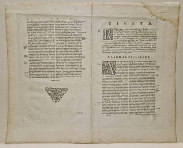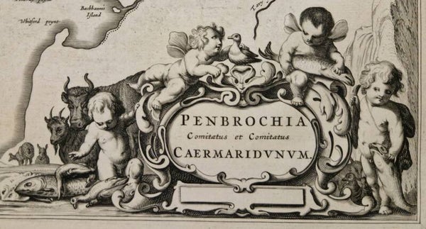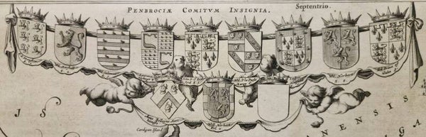 - Deze oude kaart is van Penbrokeshire en Caermarthen en heeft een mooie cartouche en een hoop wapenschilden. In de linkerboven hoek een watervlek. De verso is in het Latijn.