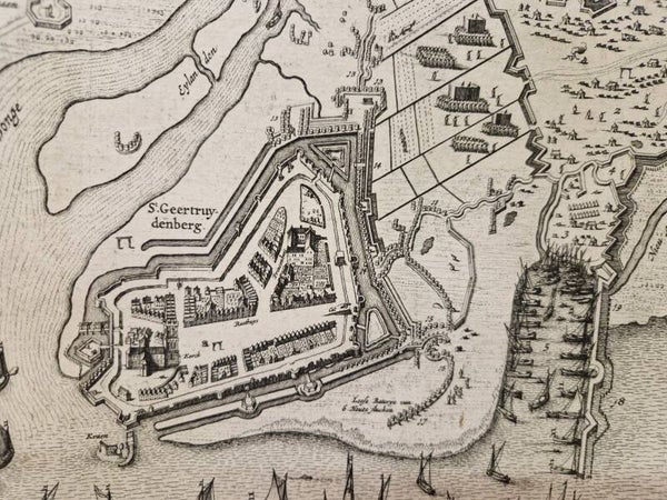 Deze in 1649 uitgegeven kaart beschrijft de belegering van Geertruidenberg door prins Maurits van Nassau uit 1593. Op de verso is het verhaal van de belegering te lezen in oud Nederlands. Er is veel aktie op deze kaart, zowel op het water als op het land. Een mooi stukje geschiedenis. De kaart is ongekleurt.