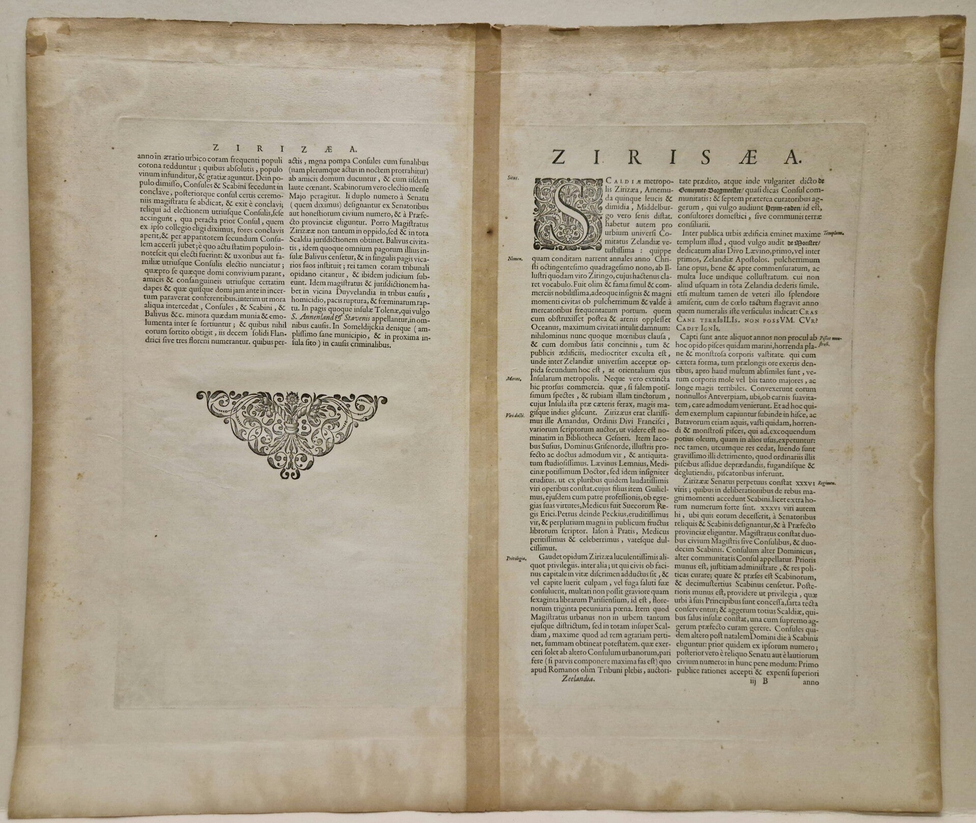 Mooi stadsplattegrond van zierikzee met de muren, kerken en huizen. Het blijft mooi om te zien dat zeilschepen in de stad kwamen. De kaart is wat vuil en de verso heeft wat bruine randen die geen invloed hebben op de kaart zelf. De verso is in Latijn.