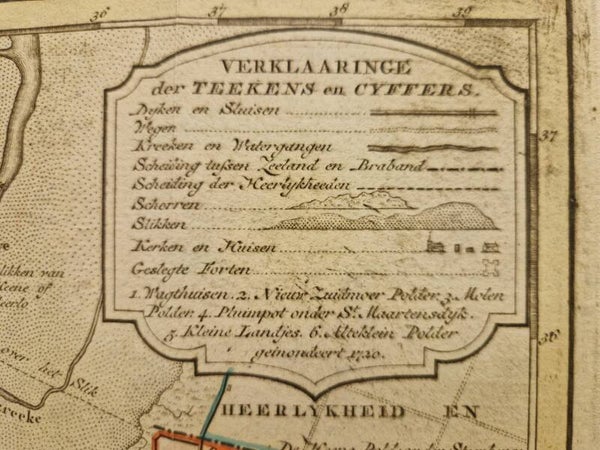 De nieuwe kaart van Tholen werd opgenomen door W.T. Hattinga in 1744 en uitgegeven door Izaak Tirion in 1753. Links onder de titel met uitgeversadres. Links boven de schaalstok en rechtsboven de legenda. Kaart is oud gekleurt en een blanco verso.