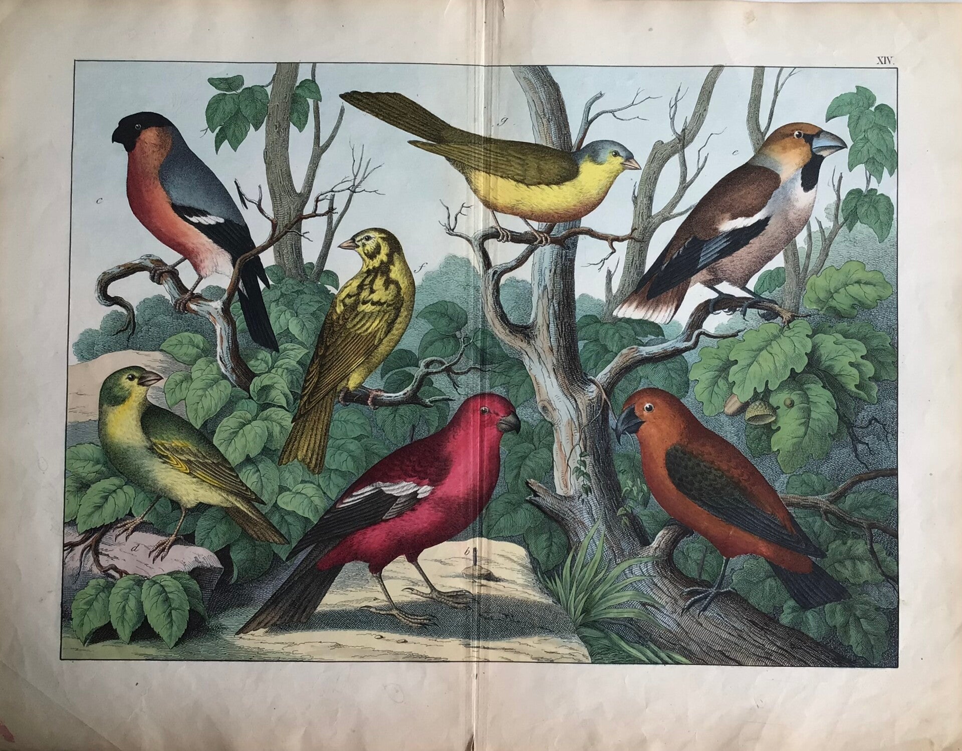 Dit is prent nr XIV met onder andere de Geelgors en het kruisbekkenafmetingen zijn 43x31,5 cm