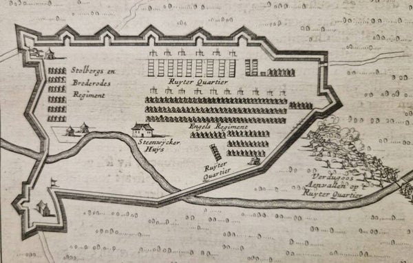 Het beleg van Coevorden op bevel van prins Maurits van Nassau. De kaart is ongekleurt en geeft veel informatie. De verso is in het Nederlands.