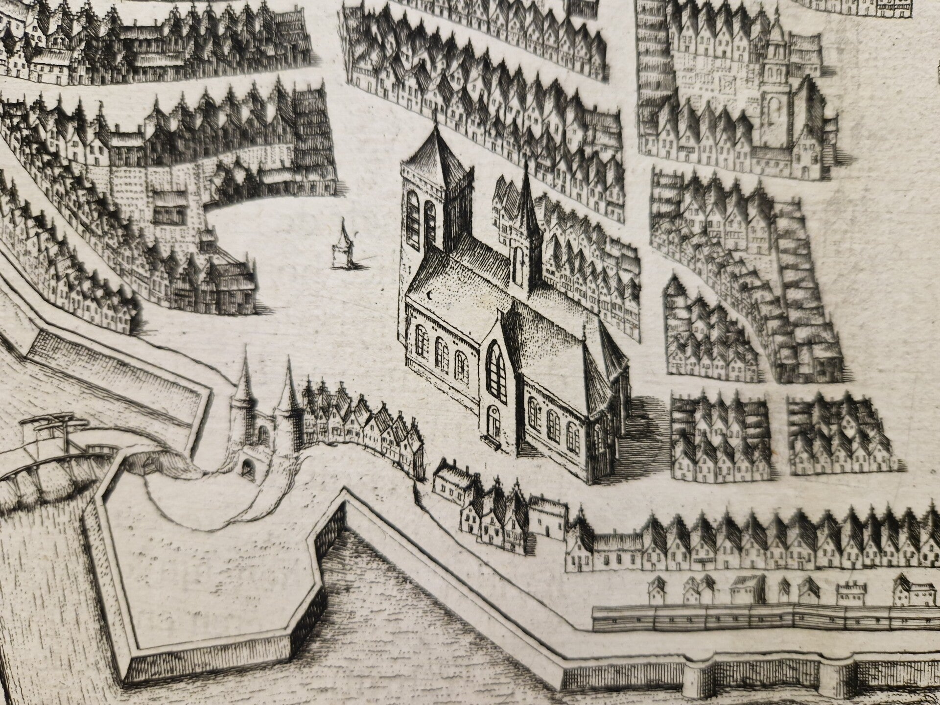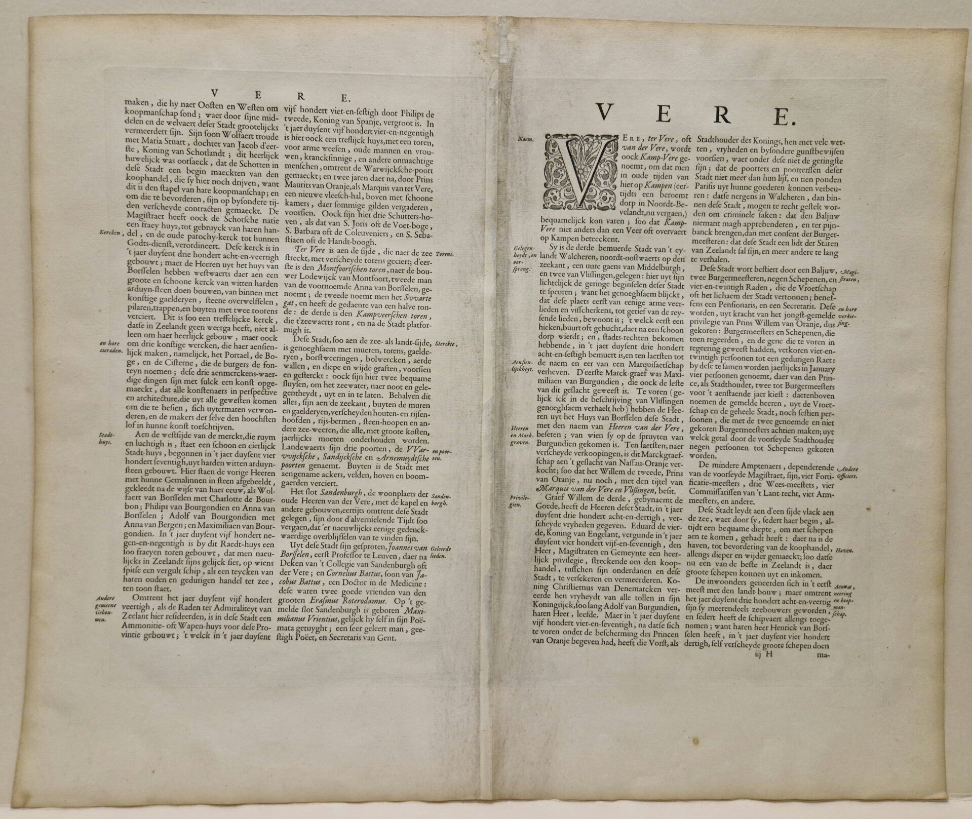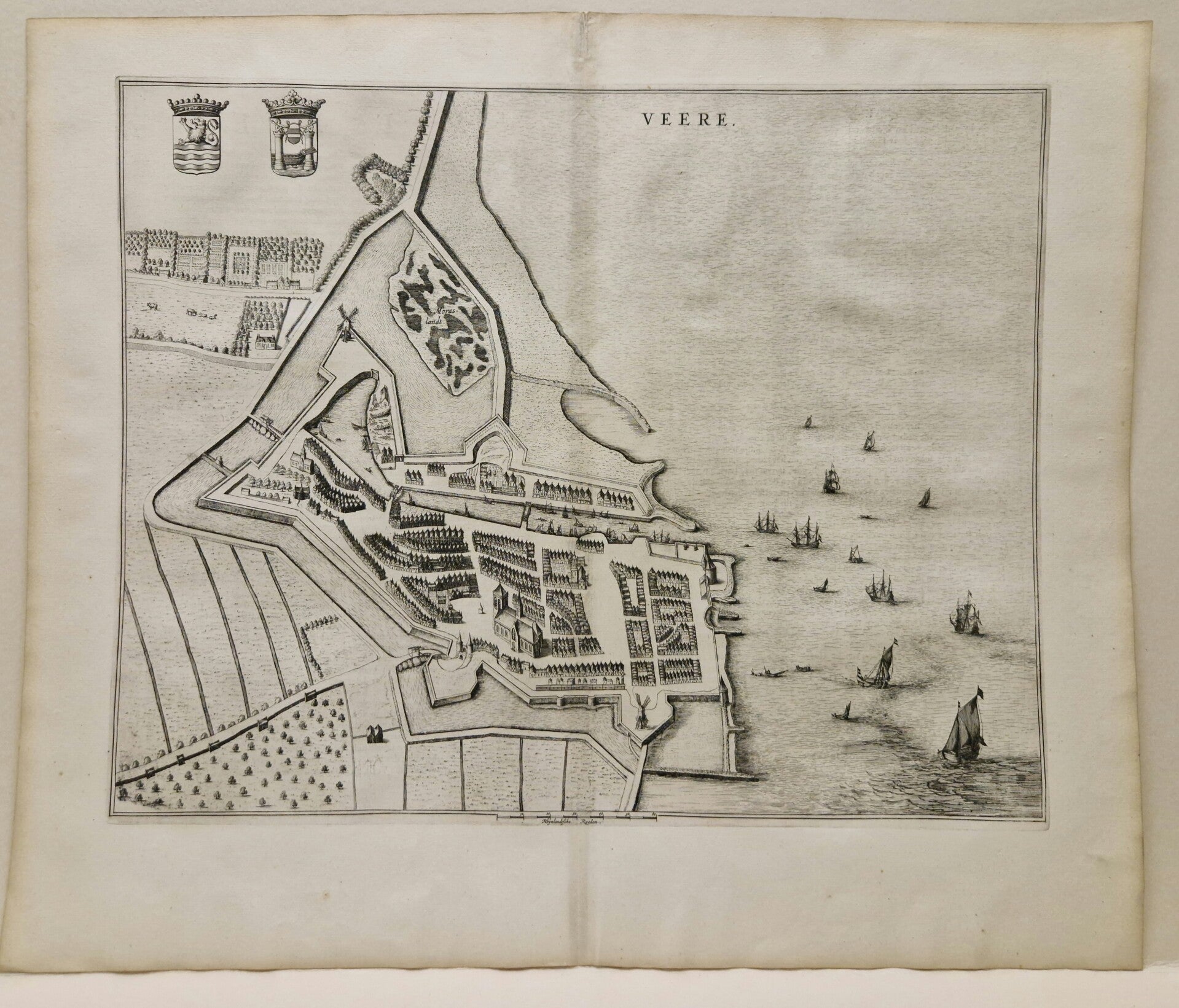 De stad Veere is hier mooi weergegeven met alle huizen, kerk en verdedigingswerken. De kaart is ongekleurt en de verso in het Nederlands.