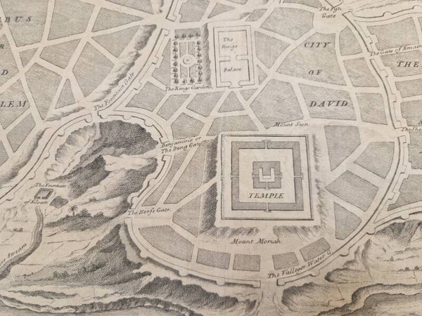 Fantastische antieke gravure is afkomstig van "Het algemeen groot historisch, oordeelkundig, chronologisch, geproduceerd, en letterlyk naam- en woord-boek, van den gantschen H. Bybel..." Dit is een gerenommeerd encyclopedisch woordenboek over alle aspecten van de geschiedenis, aardrijkskunde en cultuur van de Bijbel en Bijbelse tijden. Deze Nederlandse vertaling is afkomstig uit het werk van Calmet in het Frans, waaronder voor het eerst gepubliceerd in Parijs in 1707.