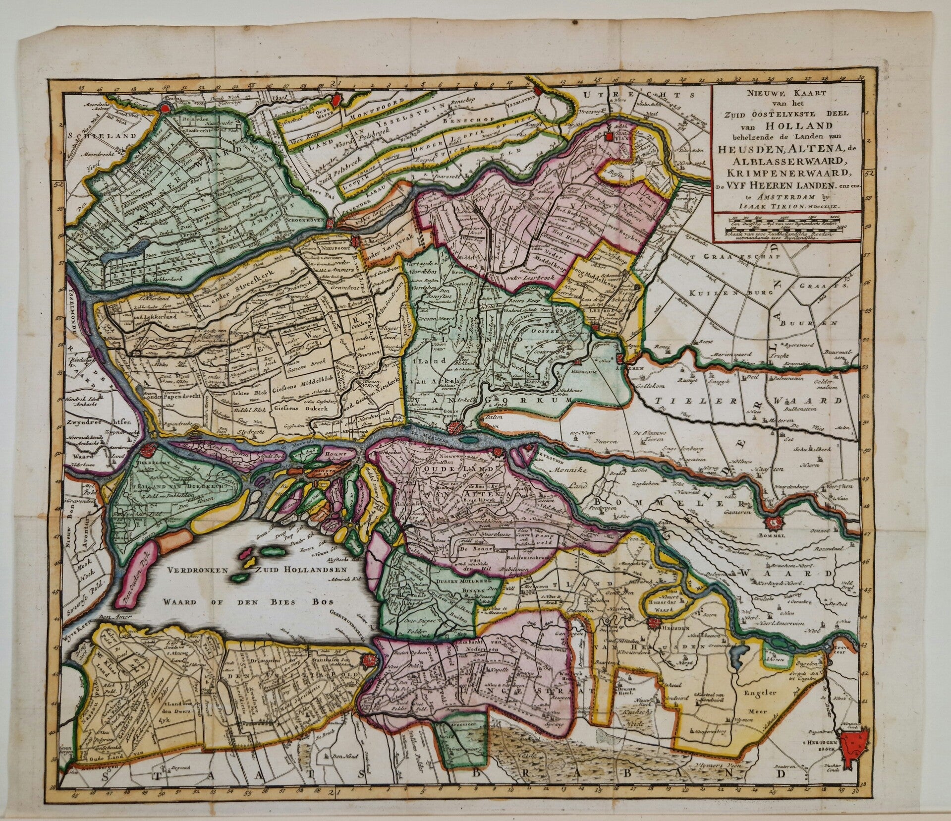 Mooie handgekleurde kaart van het Zuid-Oostelijkste deel van Holland met in het midden de Biesbosch en daarom heen een aantal oude steden als Breda, Dordrecht en Gorichem. Op deze kaart had Dordrecht nog een 4 rivieren punt omdat het Wantij nog helemaal door liep. Tegenwoordig is ook het land in de Biesbosch een stuk uitgebreider. De kaart is in goede conditie.