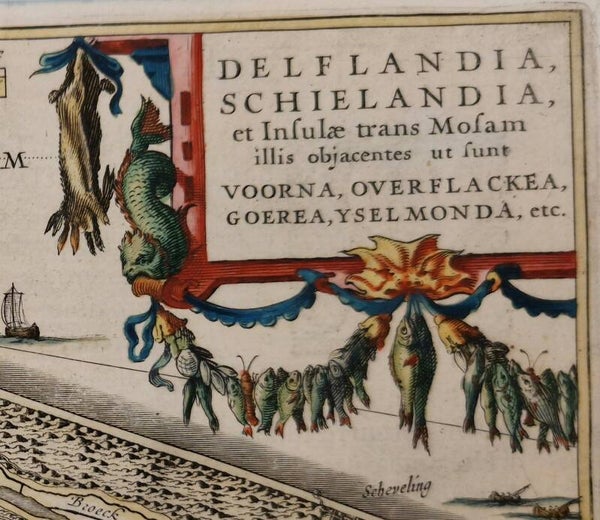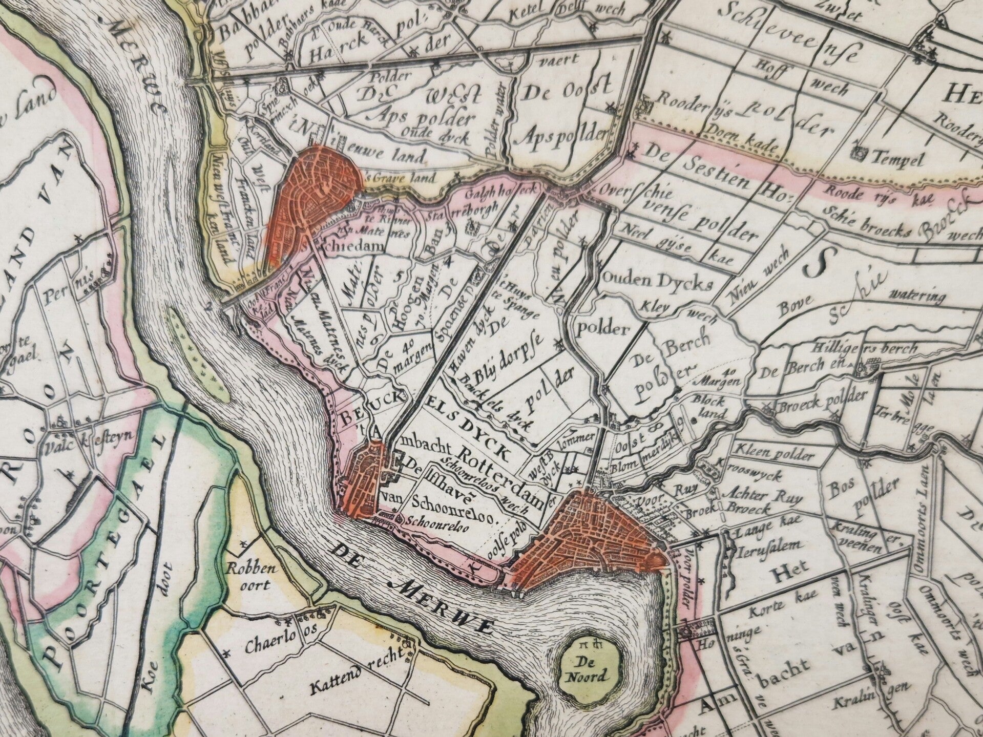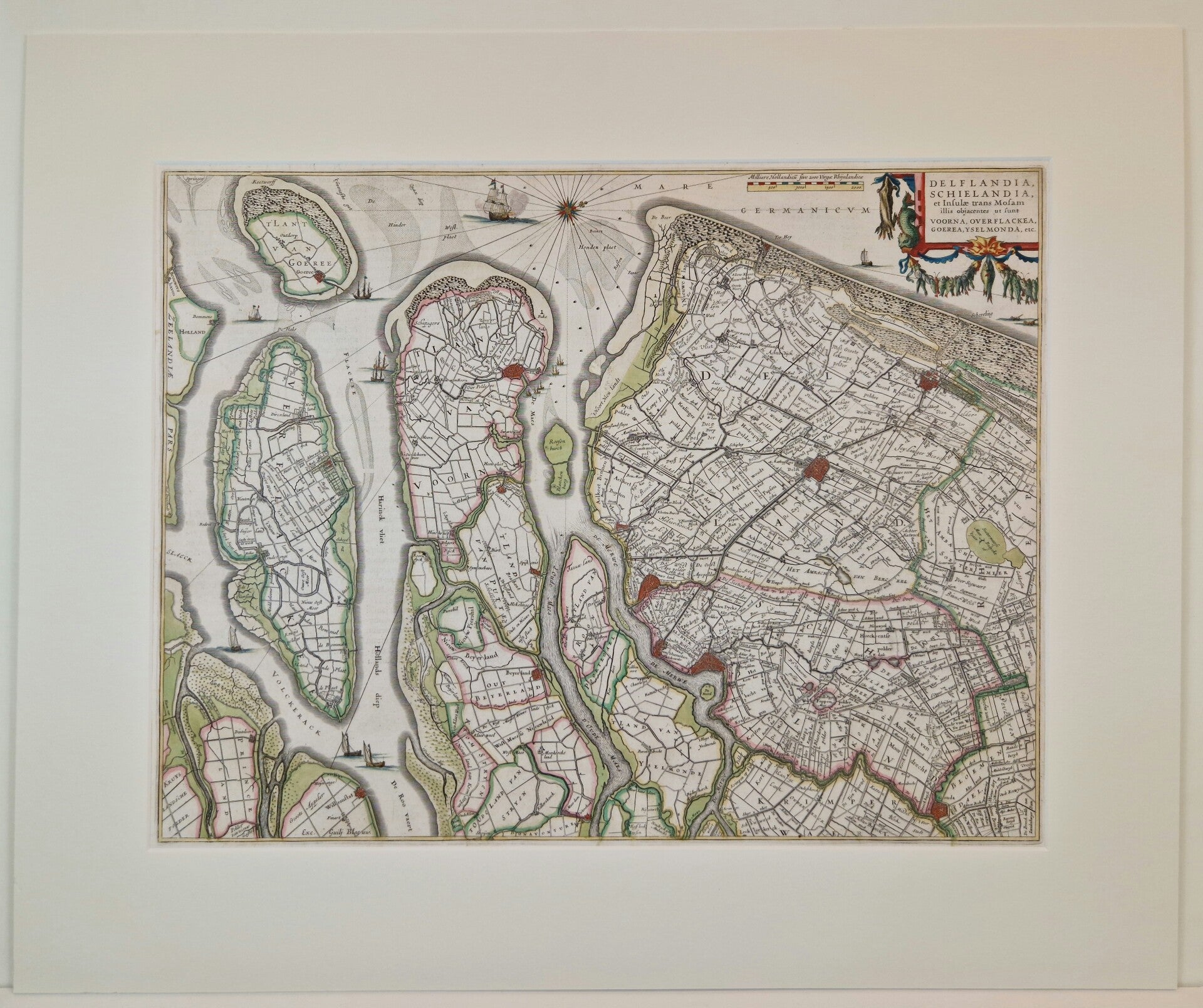Een mooie kaart van een groot stuk van Zuid-holland en een stukje Zeeland. Van Den Haag tot Bommele en van Willemstad tot Gouda. De kaart is mooi fijn gedetailleerd en het geeft een goed beeld hoe alles er rond die tijd uitzag. De kaart is in zeer goede conditie en gekleurd en voorzien van een passepartout.