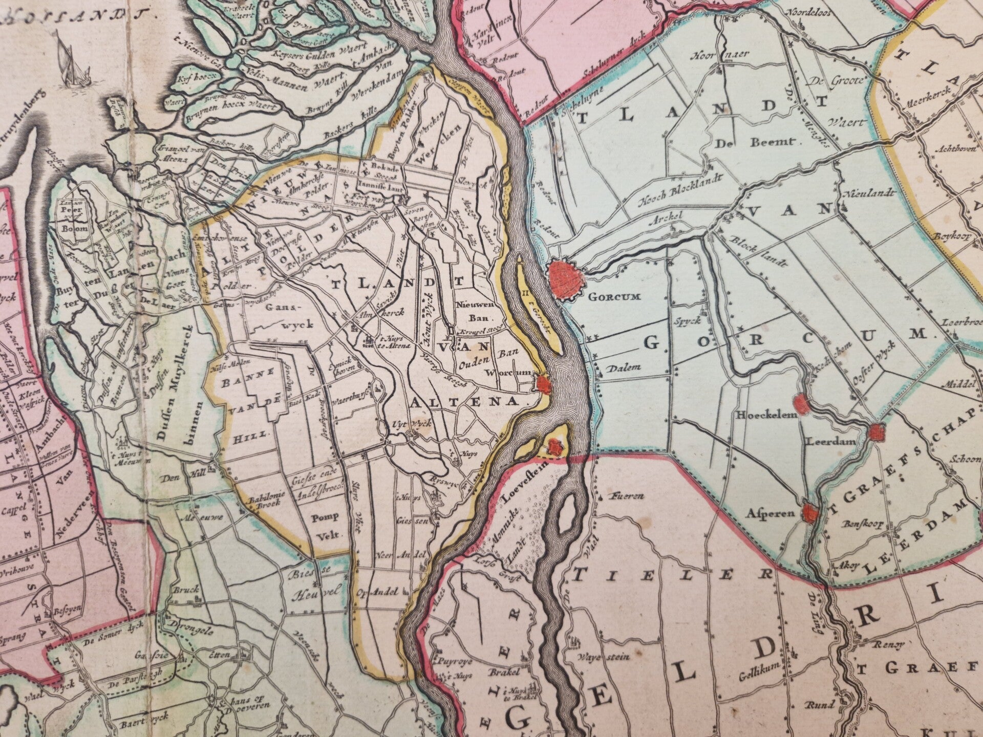 Deze kaart is van het rivierengebied de Biesbos en geeft nog steeds weer hoeveel er vanderd is na de watersnoodrampen in 1421 en 1423. Tegenwoordig is dit grote meer weer veranderd in rivieren en land. Rondom de Biesbosch een paar oude steden als Breda, Gorichem en Dordrecht. De kaart is gekleurd en in goede staat.Linksonder een cartouche met de titel en drie putti met gekroond wapenschild van Holland. Daarvoor water met man en vrouw erin wadend en ernaast zittende vrouw en man met kruik waaruit water stroomt. Op de voorgrond een steen met de schaal in Hollandse en Franse mijlen met twee putti die een duimstok vasthouden (1:170.000).