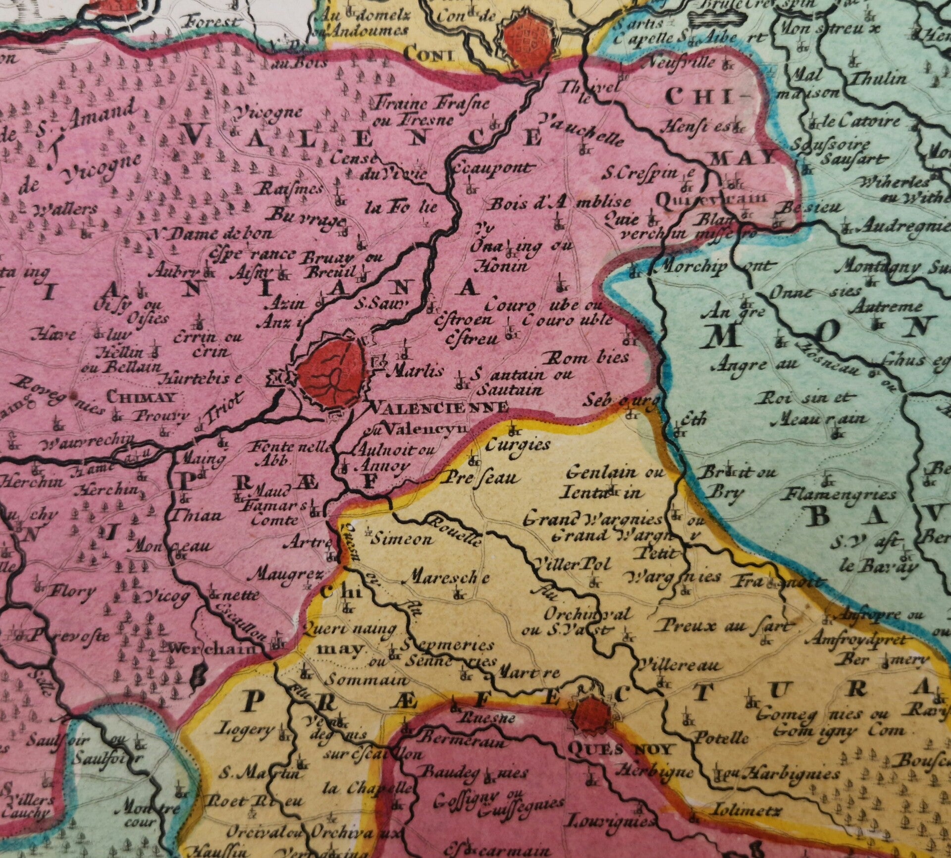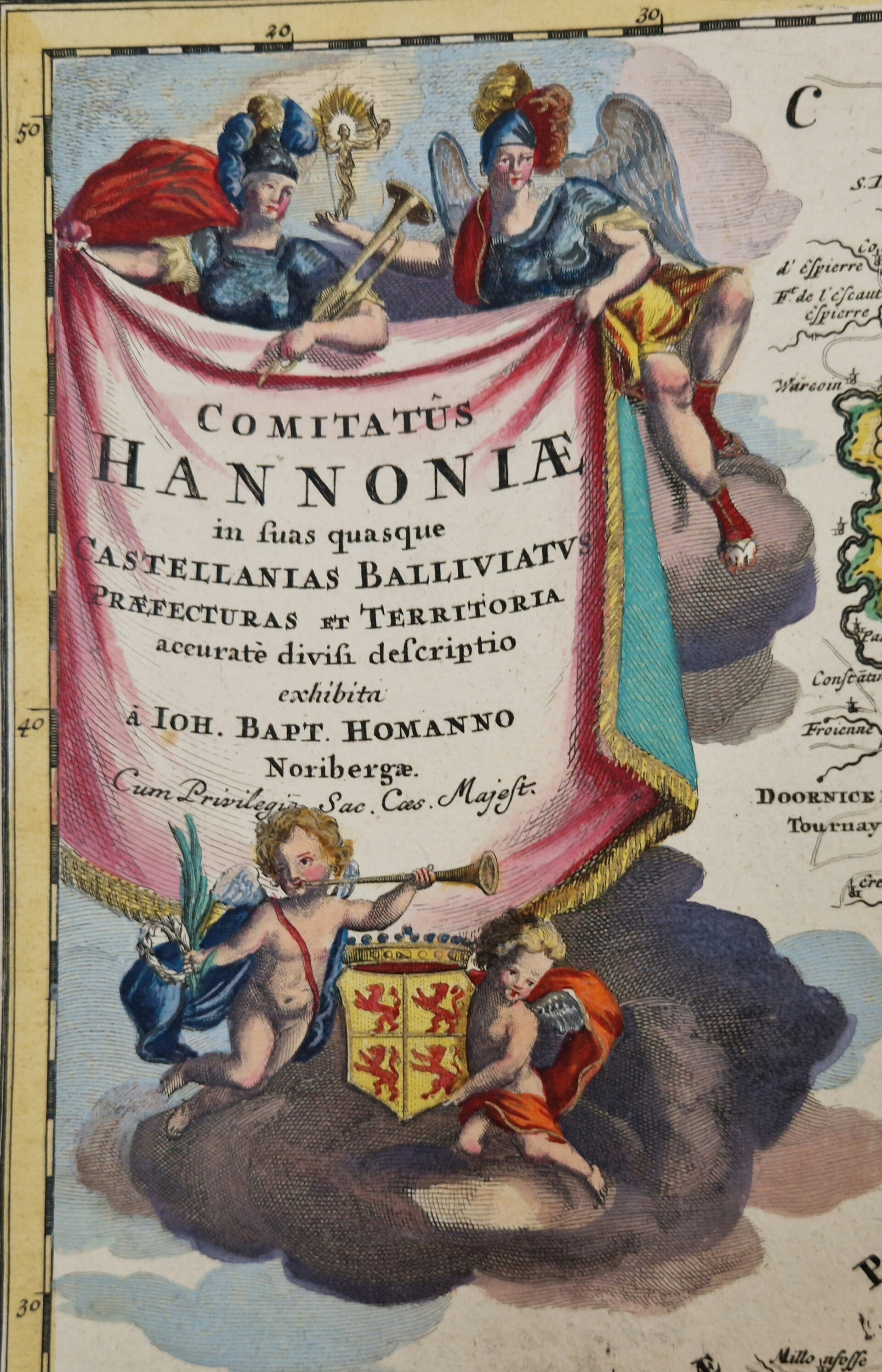 Grote kaart van het graafschap Henegauwen in Belgie. De kaart is oudgekleurd en in goede staat. Een mooie cartouche linksboven met de titel en maker. De kaart heeft kleine marges en een blaco verso.