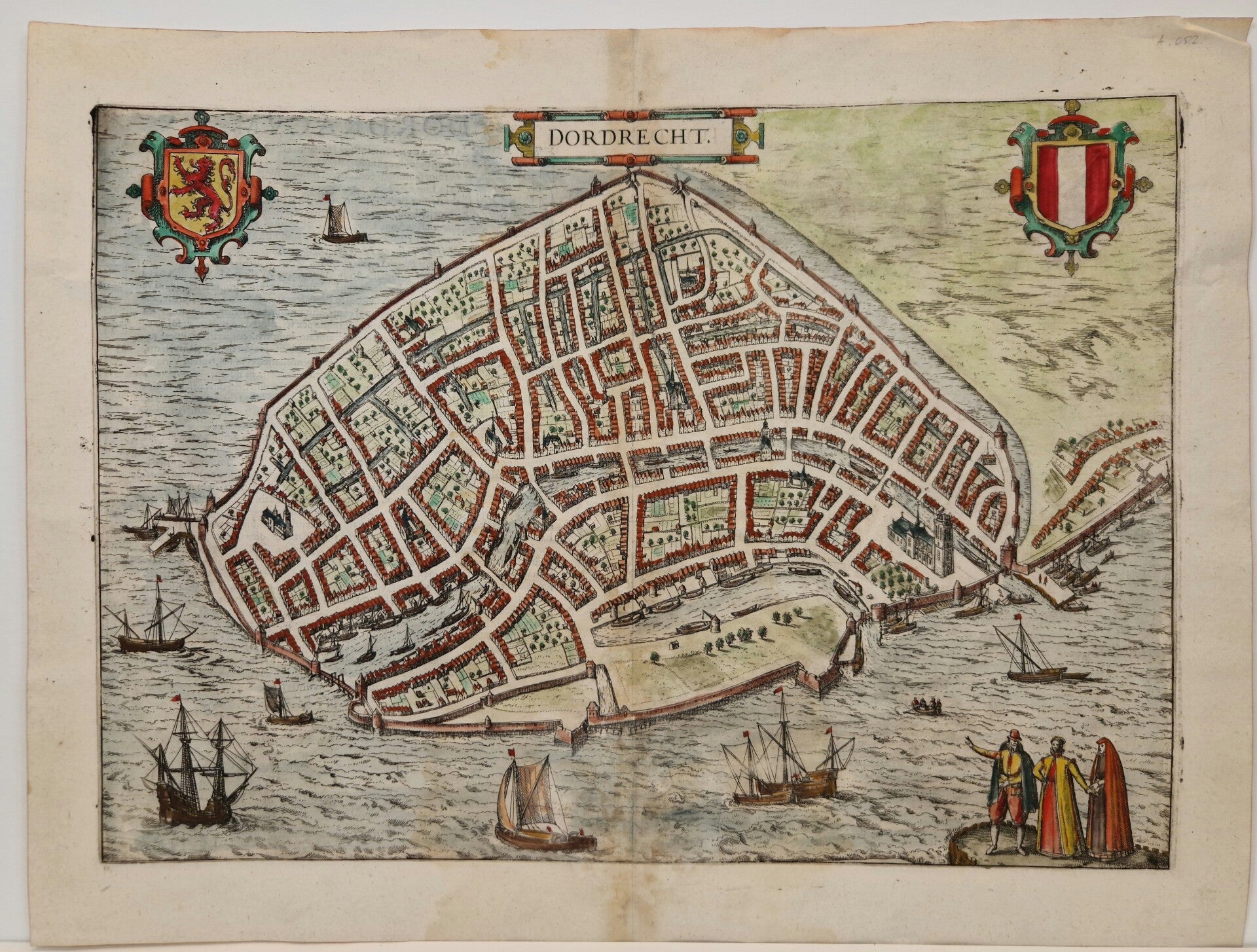 Deze kaart die oorspronkelijk door Jacob van Deventer werd gemaakt laat Dordrecht zien vanuit vogelvlucht. Dordtecht had het zgn stapelrecht waardoor ieder schip moest ontladen. De goederen gingen dan in de pakhuizen en er werd belasting over betaald. Dordrecht ligt op een kruising van drie rivieren en heeft daar eeuwen van geprofiteerd. Deze kaart geeft een mooi inzicht van deze oude stad in de 16de eeuw. De kaart heeft wat schade wat niet gek is voor een leeftijd van 440 jaar. Afm is 53 x 40.5 cm.