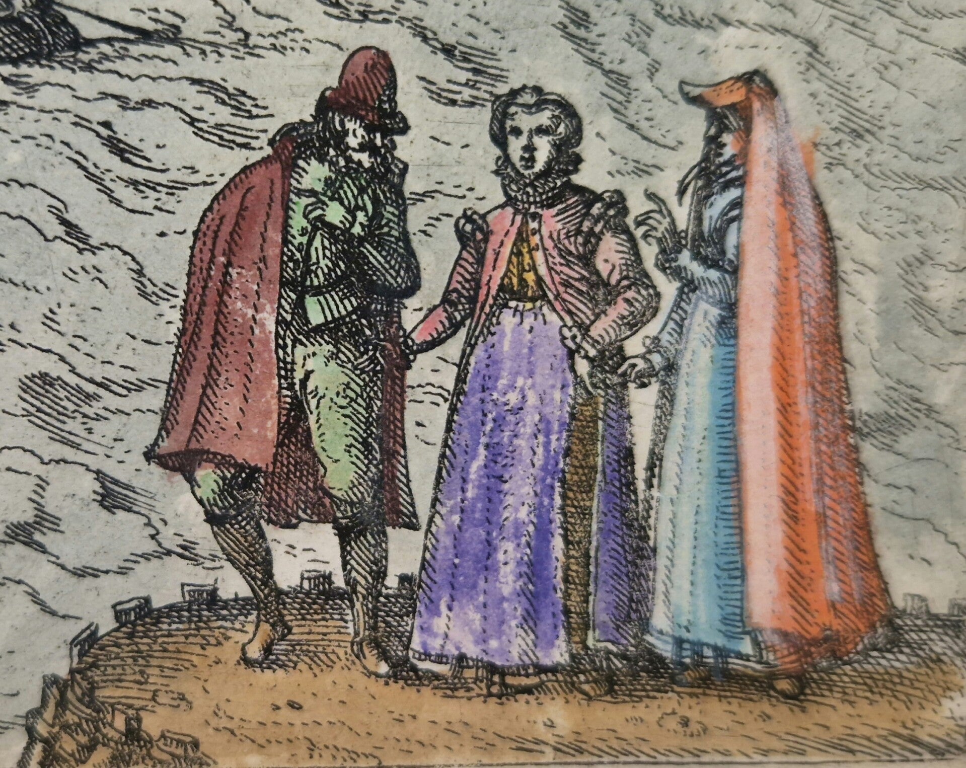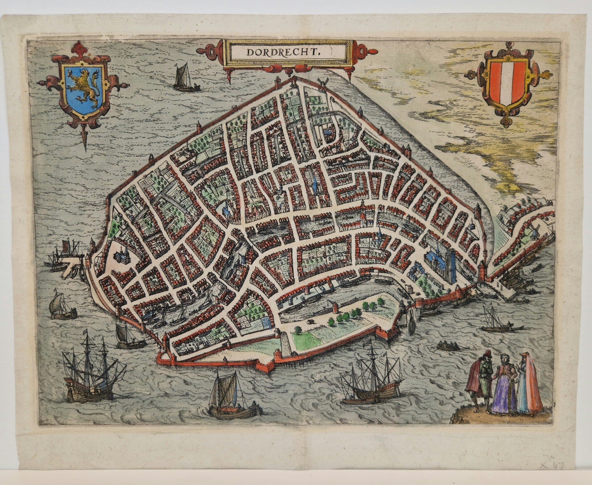 Deze gekleurde kaart is eigenlijk een kleine uitgave van Braun en Hogenberg. Er werd erg veel "geleend" van elkaar. Het oude Dordrecht met nog de mogelijkheid om het Spui rond te varen. Linksonder de mensen in klederdracht en bovenin de wapens. De afm is 32 x 24 beeld met goede marges.
