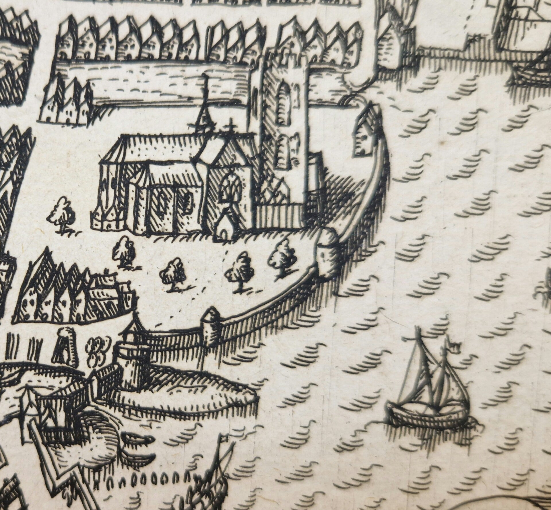 Mooi gezicht op de stad Dordrecht. Deze kaart is nieuwer dan de kaarten van Braun en hogenberg omdat hier het gebied tussen de Nieuwe haven en de rivier bebouwd is. De kaart geeft veel details over de stad. De cartouche is leeg. De kaart is ongekleurd. Afm is 32 x 24 cm op blad.