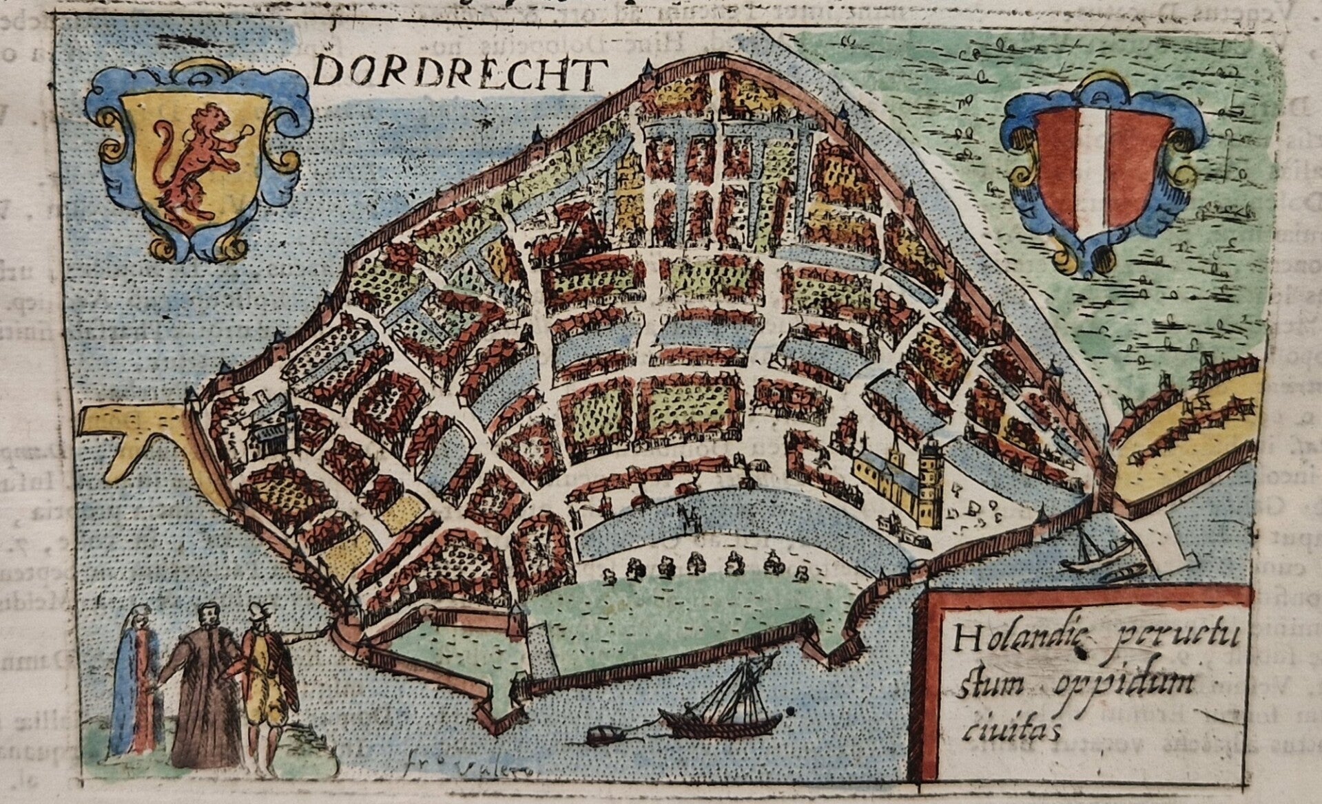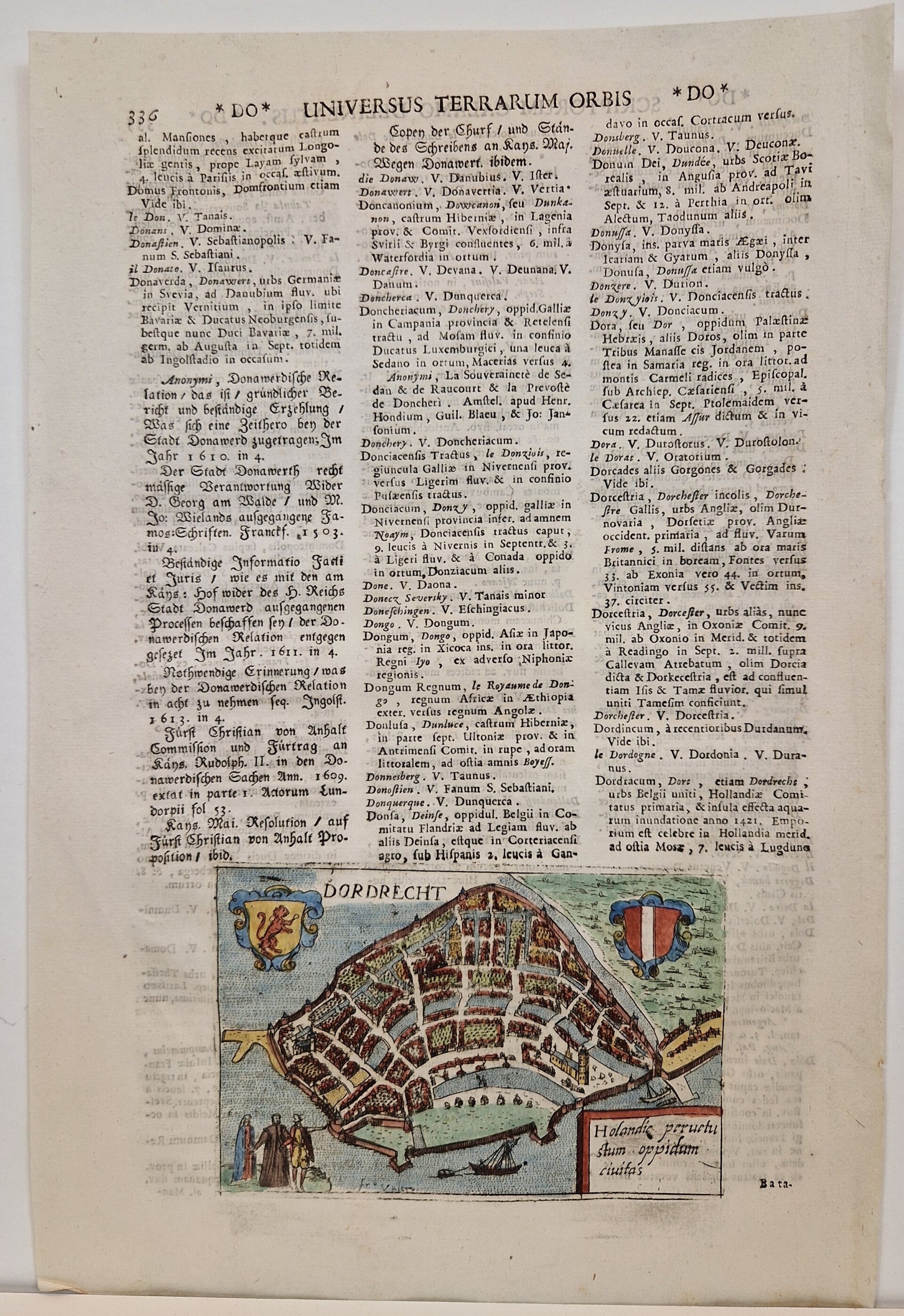 Een bladzij uit een Italiaans woordenboek met een kleine beschrijving van Dordrecht en een kleine sfbeelding. We zien een zeer oude afbeelding van de stad van rond 1550.