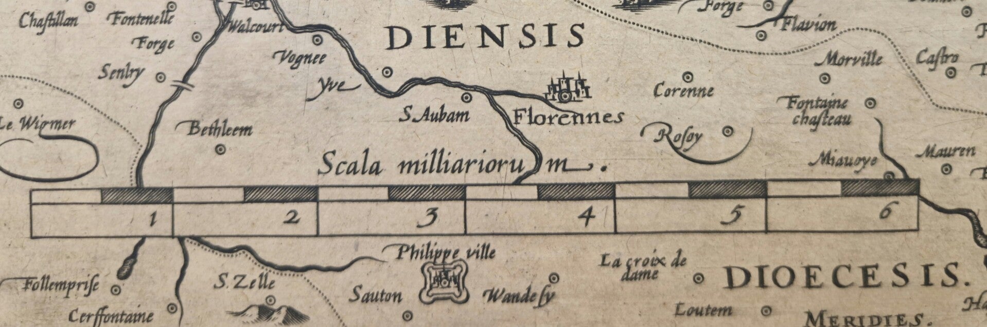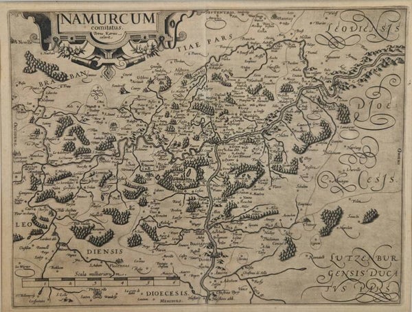 Landkaart van het graafschap Namen, met titel links bovenaan in fraaie rolwerkcartouche. Uitgegeven te Amsterdam door Cornille Nicolas, MDCIX (1609), in de beroemde beschrijving van de Nederlanden door Lodovico Guicciardini (1521-1589): 'Description de Tous les Pays-Bas, autrement appelez la Germanie Inferieure, ou Basse Allemange.