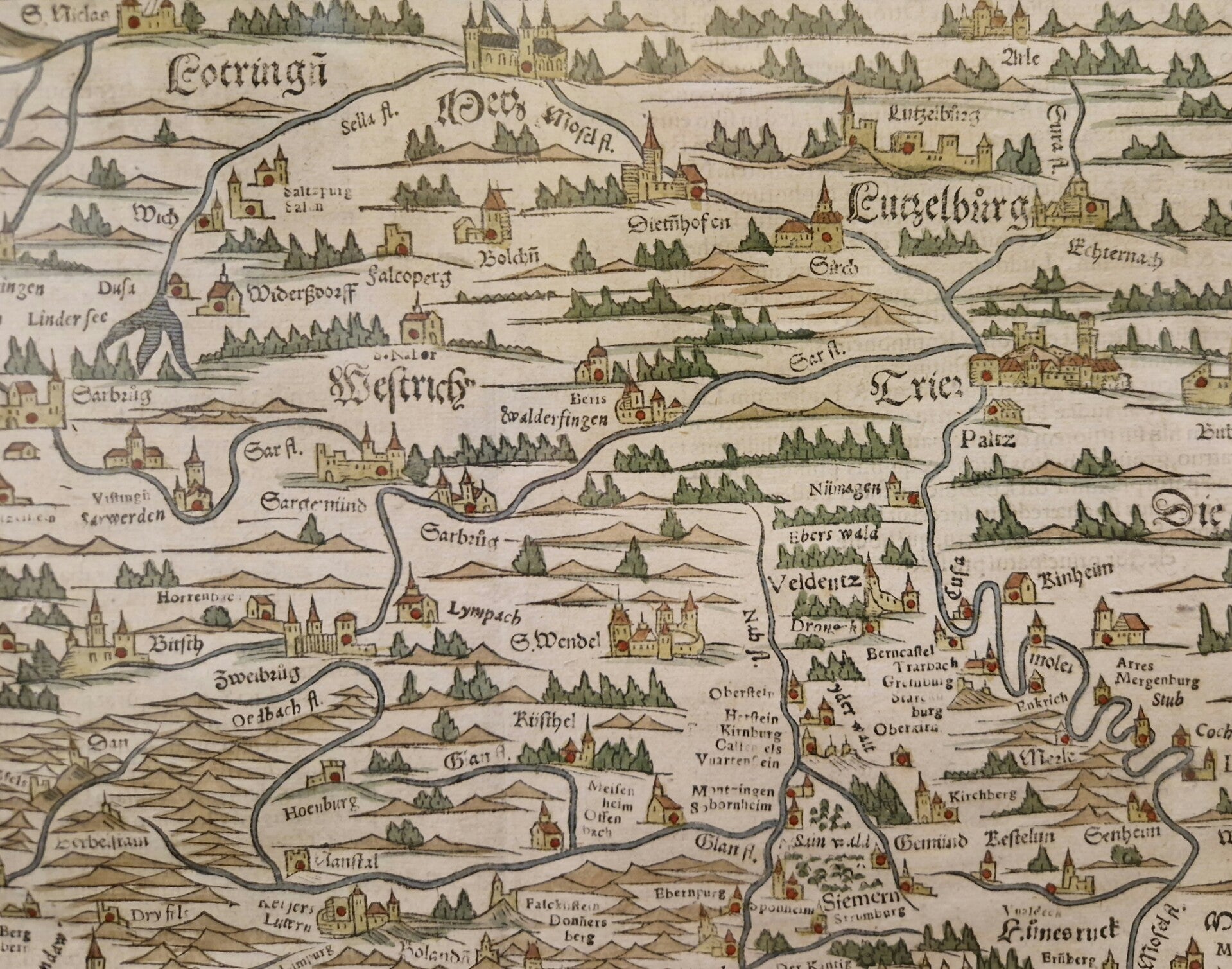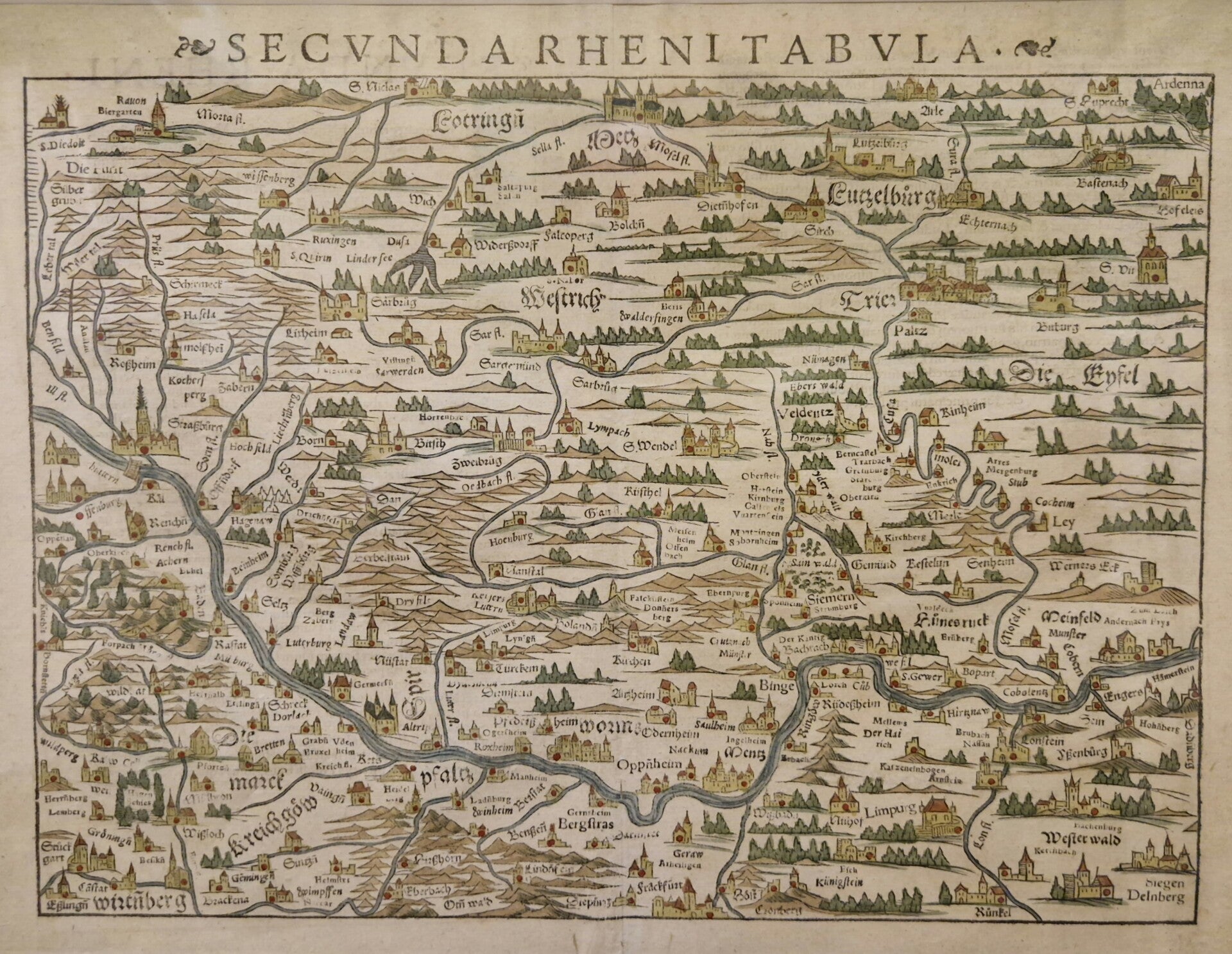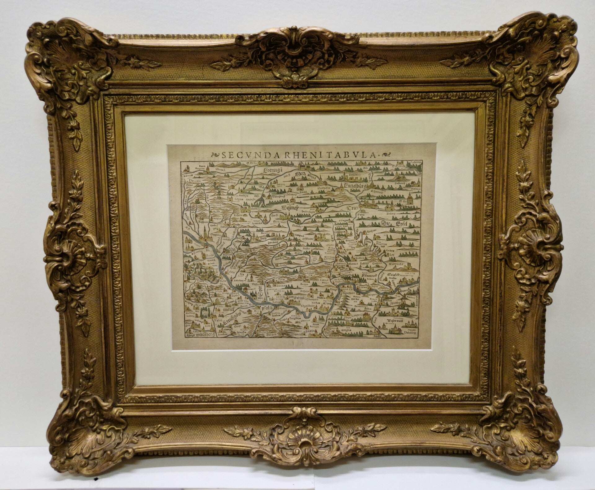 Een zeer oude kaart van het rijndal en omgeving. Deze houtsnede is uit 1552 en is altijd goed bewaard gebleven. Hij is oud gekleurt en geeft een simpel maar duidelijk beeld van het Rijndal en omliggende steden. De kaart is ingelijst in een oude lijst in zeer goede conditie. Versturen is mogelijk maar alleen op afspraak.