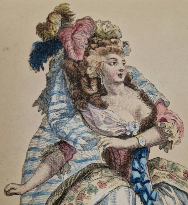Een jonge dame met prachtig gekapt haar en een nieuw model jurk voor de Opera. Galerie des Modes et Costumes Français is een serie mode- en kostuumborden die werd verspreid in Parijs van 1778 tot 1787, tijdens het bewind van koning Lodewijk XVI van Frankrijk en Marie Antoinette. Het eerste verzamelde deel, dat in 1779 werd geproduceerd, had een titelpagina met een allegorische illustratie en de volledige titel van de collectie: Gallerie des modes et des costumes français dessinés d'après nature, Gravés par le plus Célèbres Artistes en ce genre, et colorés avec le plus grand soin par Madame Le Beau. Ouvrage begin en l'année 1778. A Paris, chez le Srs Esnauts et Rapilly rue St. Jacques à la Ville de coutances. Avec priv. Du Roi (Galerij van Franse mode en kostuums, naar het leven getekend, gegraveerd door de meest gevierde kunstenaars in dit medium, en met de grootste zorg met de hand ingekleurd door Madame Le Beau; publicatie begonnen in 1778. Parijs, heren Esnauts en Rapilly, rue Satin-Jacques, bij het uithangbord van de Stad der Countances (vergunning verleend door de koning). Belangrijk is dat deze langere bijnaam aangeeft dat de gravures van de Galerie (of Gallerie, volgens de achttiende-eeuwse spelling) 'd'après nature' of 'naar de natuur' zijn gemaakt, wat betekent dat ze bedoeld waren om weer te geven wat er daadwerkelijk in de straten van Parijs in de tweede helft van de achttiende eeuw.