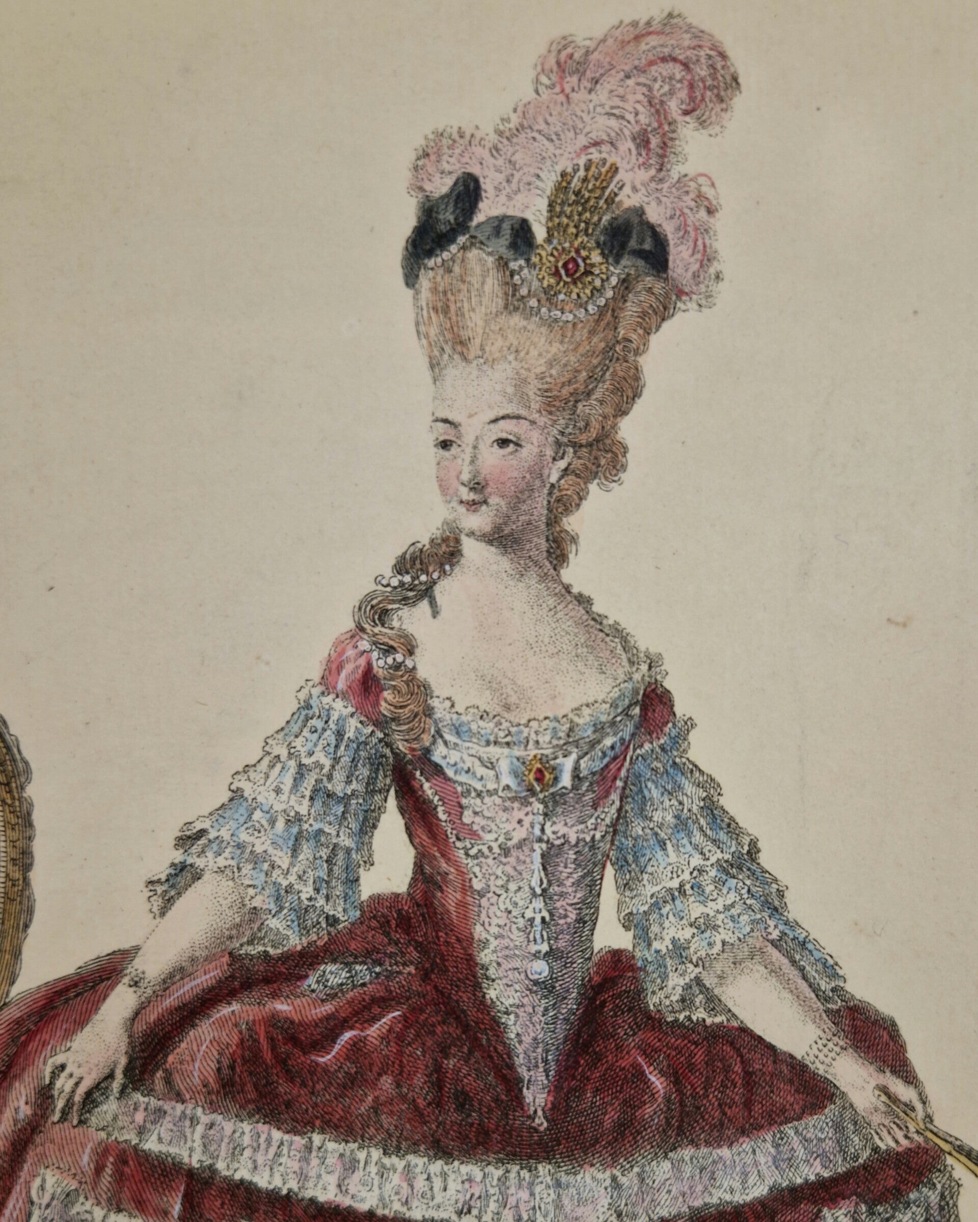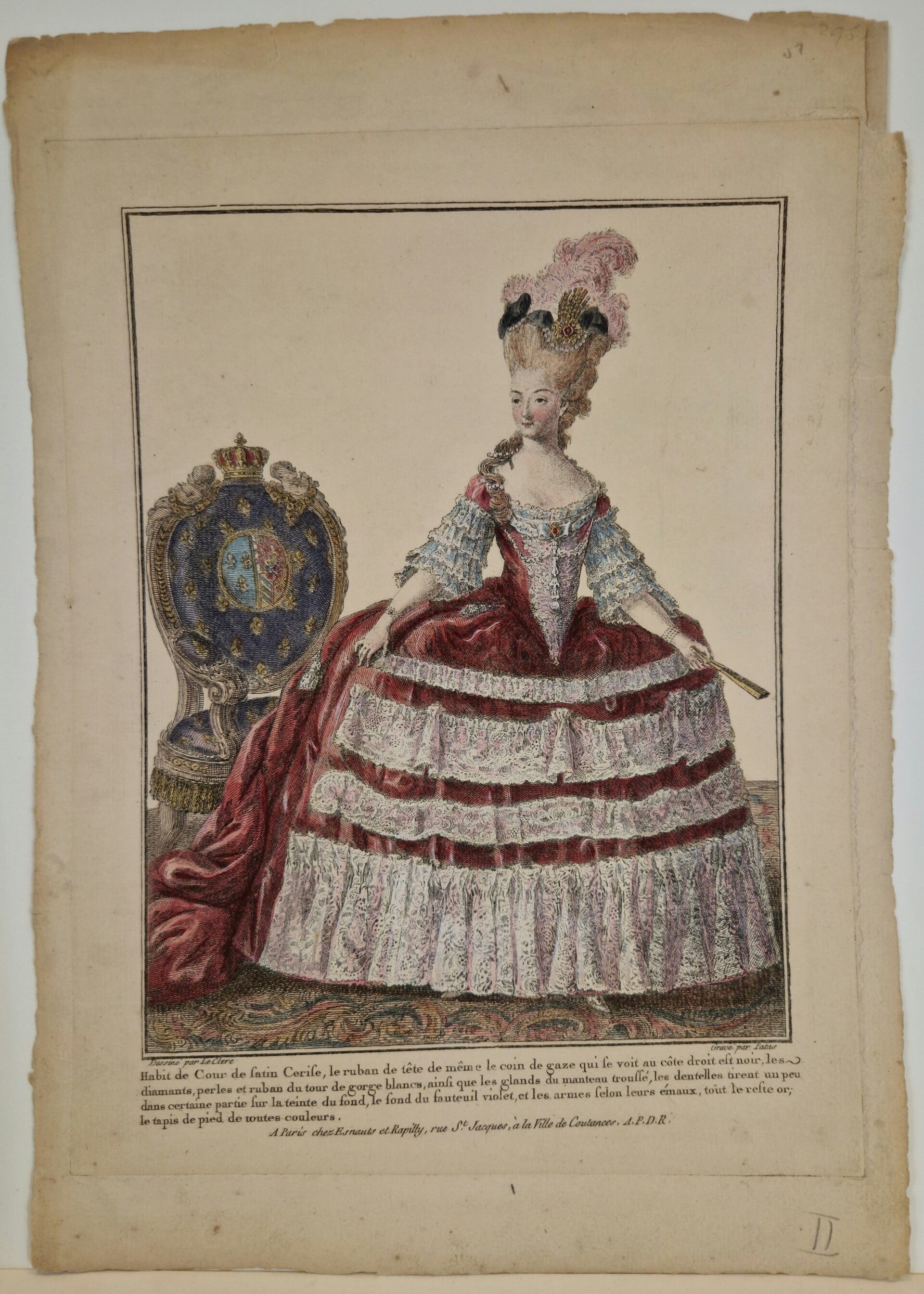 Een dame met een eenvoudige hofjurk, afgezet met parels, robijnen en diamanten. Galerie des Modes et Costumes Français is een serie mode- en kostuumborden die werd verspreid in Parijs van 1778 tot 1787, tijdens het bewind van koning Lodewijk XVI van Frankrijk en Marie Antoinette. Het eerste verzamelde deel, dat in 1779 werd geproduceerd, had een titelpagina met een allegorische illustratie en de volledige titel van de collectie: Gallerie des modes et des costumes français dessinés d'après nature, Gravés par le plus Célèbres Artistes en ce genre, et colorés avec le plus grand soin par Madame Le Beau. Ouvrage begin en l'année 1778. A Paris, chez le Srs Esnauts et Rapilly rue St. Jacques à la Ville de coutances. Avec priv. Du Roi (Galerij van Franse mode en kostuums, naar het leven getekend, gegraveerd door de meest gevierde kunstenaars in dit medium, en met de grootste zorg met de hand ingekleurd door Madame Le Beau; publicatie begonnen in 1778. Parijs, heren Esnauts en Rapilly, rue Satin-Jacques, bij het uithangbord van de Stad der Countances (vergunning verleend door de koning). Belangrijk is dat deze langere bijnaam aangeeft dat de gravures van de Galerie (of Gallerie, volgens de achttiende-eeuwse spelling) 'd'après nature' of 'naar de natuur' zijn gemaakt, wat betekent dat ze bedoeld waren om weer te geven wat er daadwerkelijk in de straten van Parijs in de tweede helft van de achttiende eeuw.