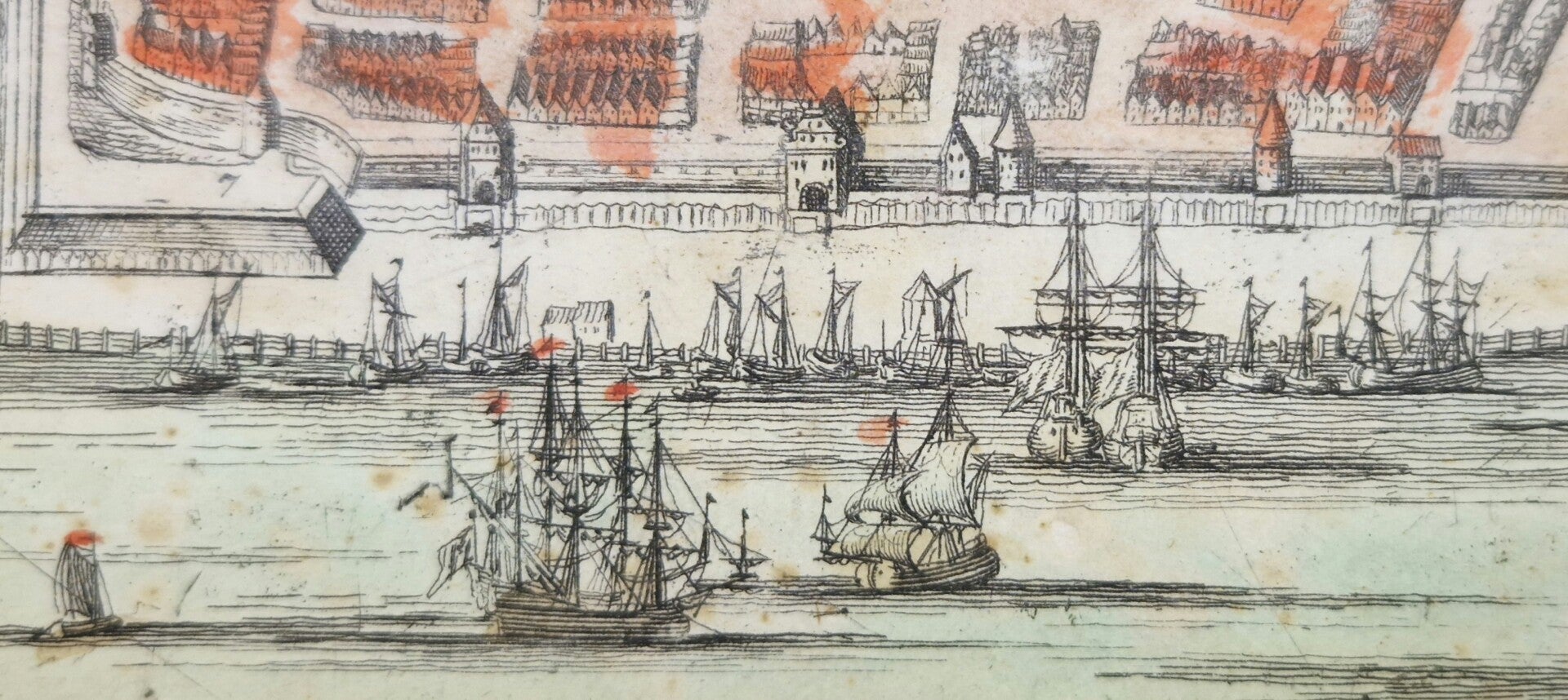 Mooi aangezicht van de stad Riga in Letland. De stad is een belangrijke haven wat ook te zien aan de vele schepen. Deze kaart is in de stijl van Merian alleen kon de juiste (nog) niet vinden. Kaartje komt met passepartout.