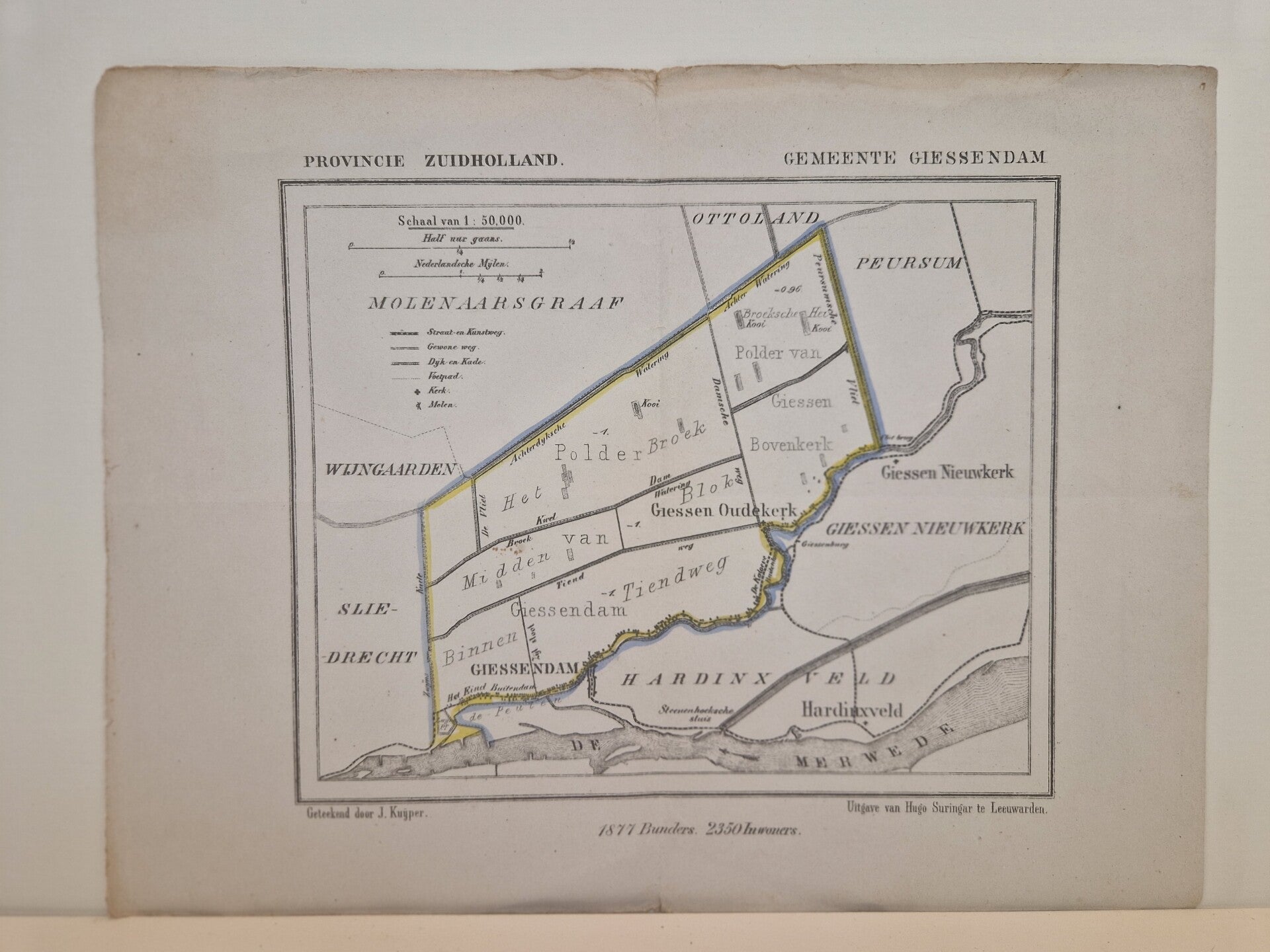 Kaartje van de gemeente Giessendam met daarop aangegeven Giessen Oudekerk, Giessendam, Binnen Tiendweg en de Broeksche Hei.