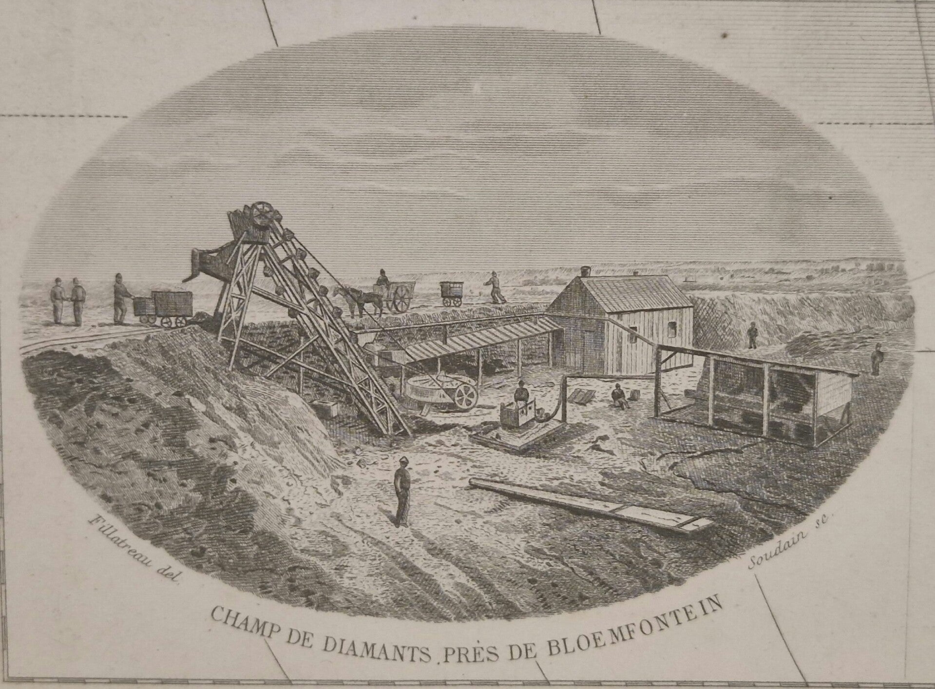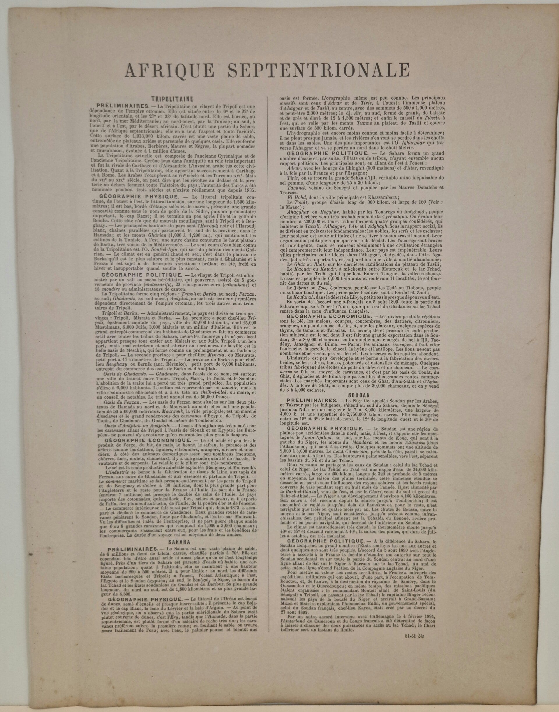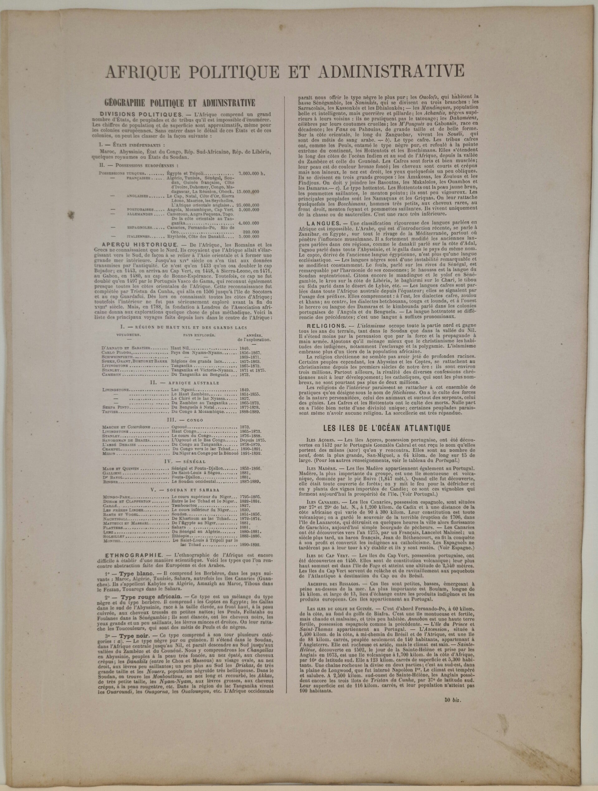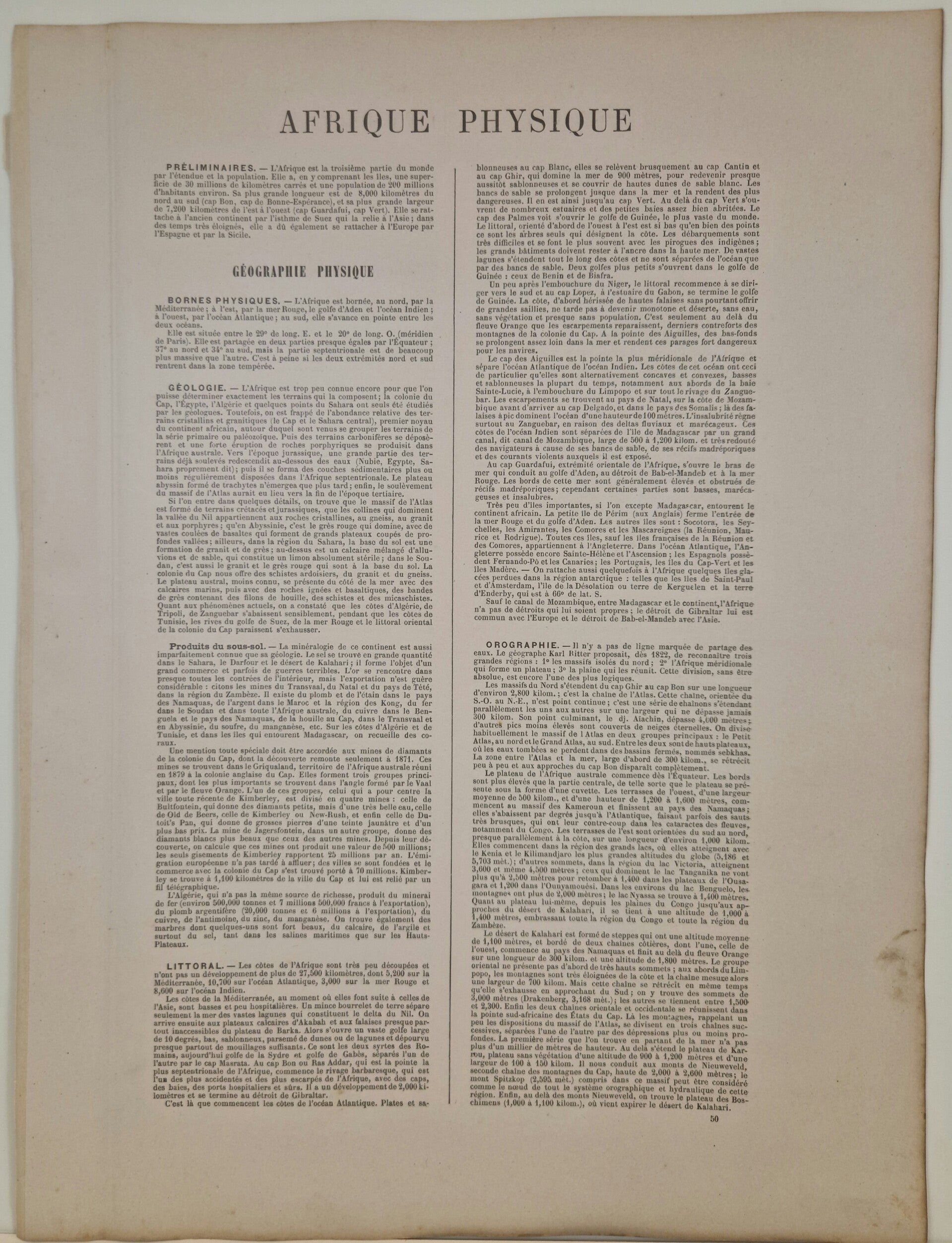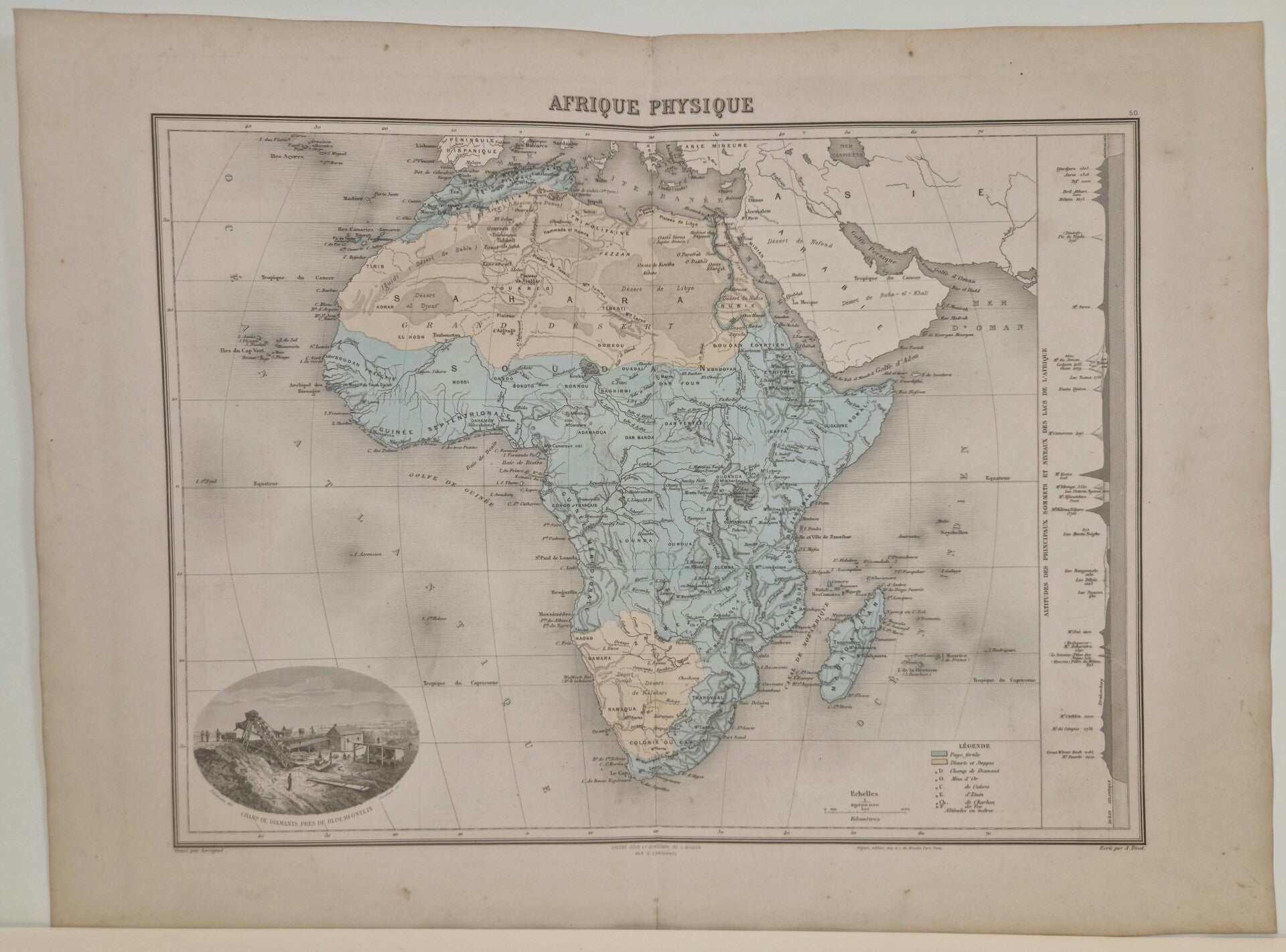 Twee oude kaarten getiteld 'Afrique Physique en Afrique politique. Ze komen samen met twee pagina's begeleidende teksten. Met decoratief vignet van Sint-Helena en de diamantwi ning in Bloemfontein. Deze kaarten komen uit de "Géographie Universelle Atlas-Migeon" van J. Migeon.