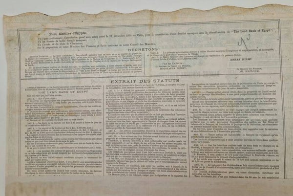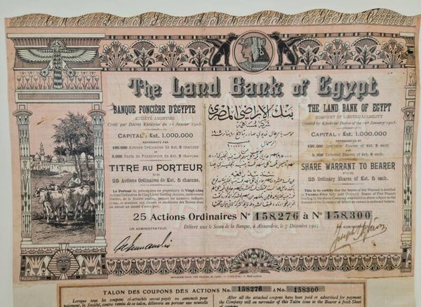 Zeer decoratief aandeel uit 1905. Het is versierd met oude Egyptische decoraties en een landbouw scene. De aandelencertificaten zijn uitgegeven door de Land Bank of Egypt, een grote bankinstelling die in 1904 in Caïro is opgericht. De certificaten zijn met de hand ondertekend en voorzien van een blad met dividendbewijzen dat op de bodem is geplakt. Het document is met name vertaald in drie verschillende talen: Frans, Arabisch en Engels.
