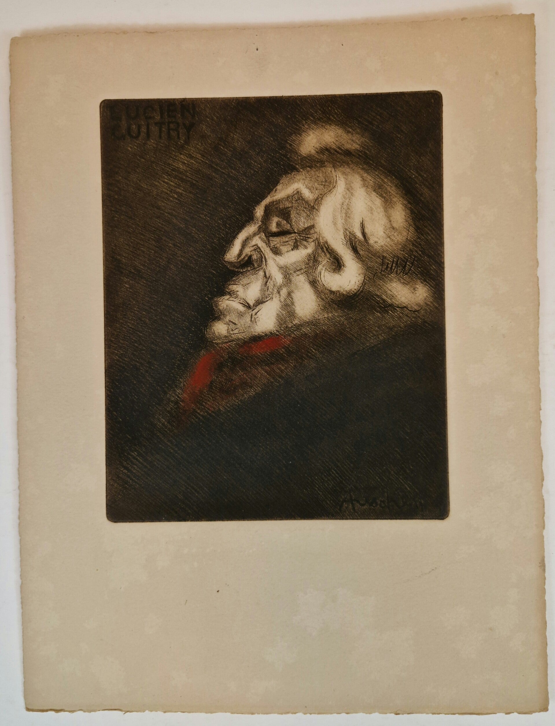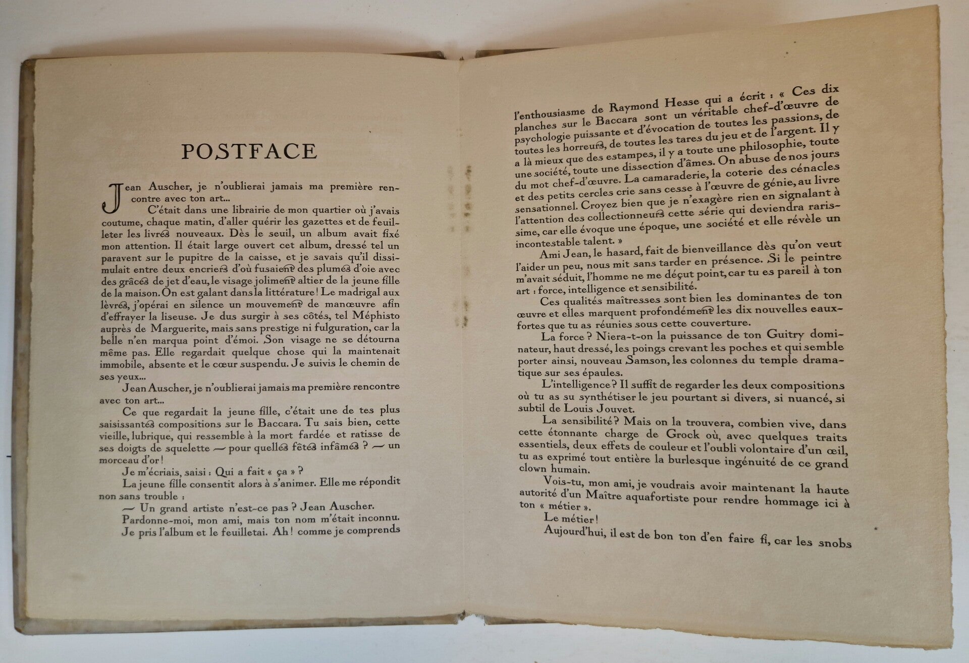 Jean Auscher is geboren in 1896 en overleed in 1985. Hij was een karikatuur schilder. 9 prenten van Jean Auscher met een nawoord van Alfred Machard. Parijs: de voetafdruk, (1925). In bladen, onder een gedrukte uitgavemap, met opengewerkt vierkant vak waarin de titel zichtbaar is. Zeer mooie verzameling van 9 kleurenprenten van Jean Auscher die de portretten voorstellen van de Zwitserse clown Grock, de zangeres Yvette Guilbert, de acteurs Lucien Guitry (x 2) en Louis Jouvet (x 2), de actrice Maud Loty, de zangeres en actrice Claude Meller, actrice Vera Sergine en Carajo Santo. Een van de 422 exemplaren op Arches-papier, deze verrijkt met een zwart gelithografeerd portret van Auscher, gedateerd 1945. Enkele lichte scheurtjes in het papier dat de map omhult. Het transparante raampapier is weg. Alles op zeer goed linnen papier. Genummerde oplage van 422 exemplaren. Dit is nr14. Originele map is in slechte staat maar origineel. alle gravures in goede staat.