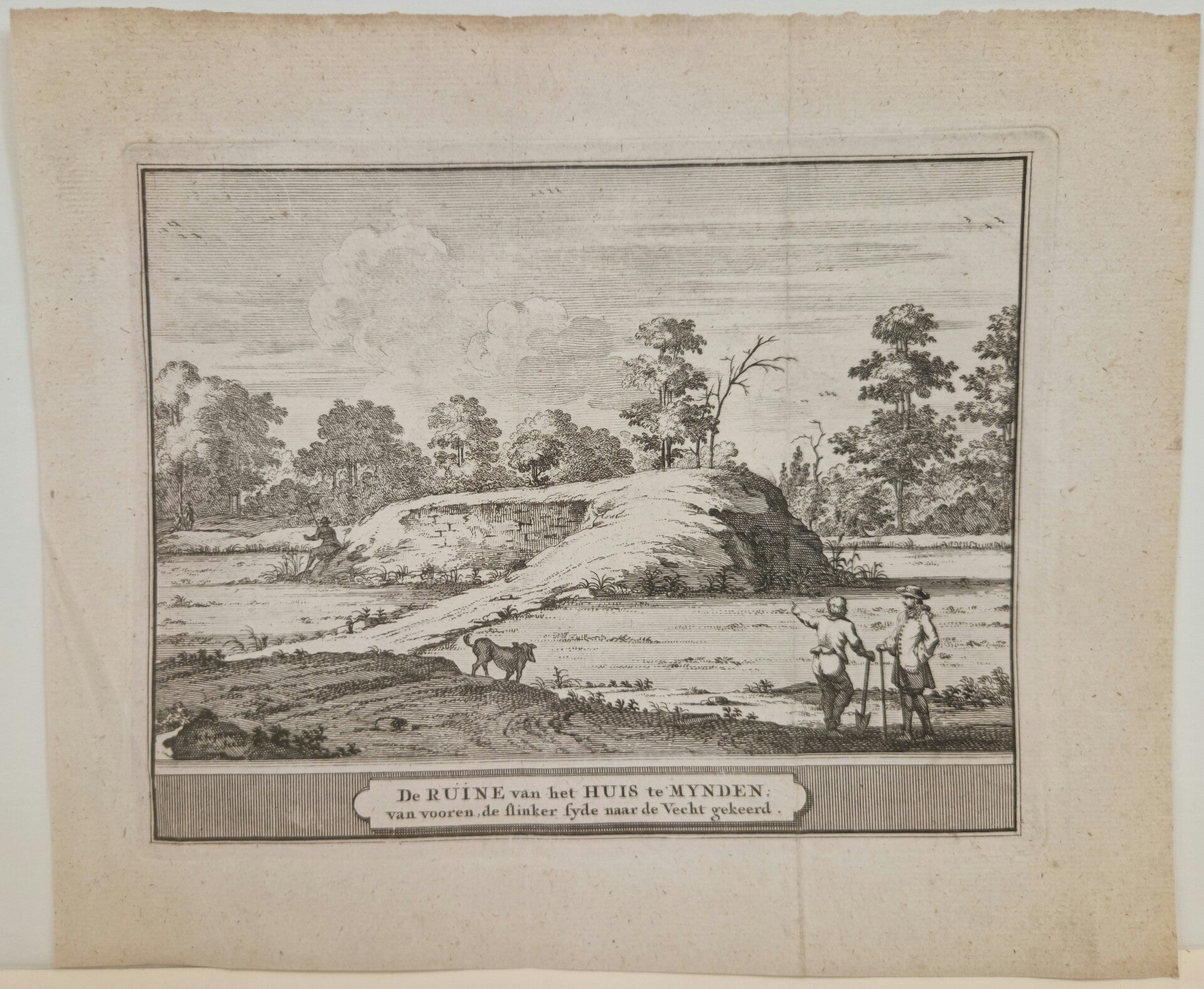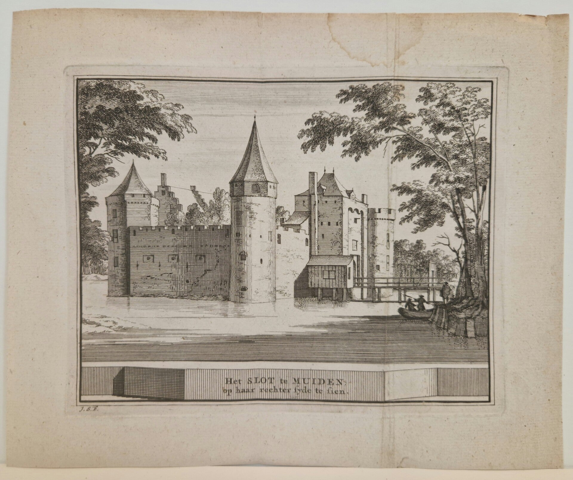 5 gravures van bekende en minder bekende kastelen in Nederland De Ruïne van het Huis te Mynden, Vecht. Het huis ter Marquette. Het Muiderslot. Slot Loevestein. Het huis te Maarssenveen.