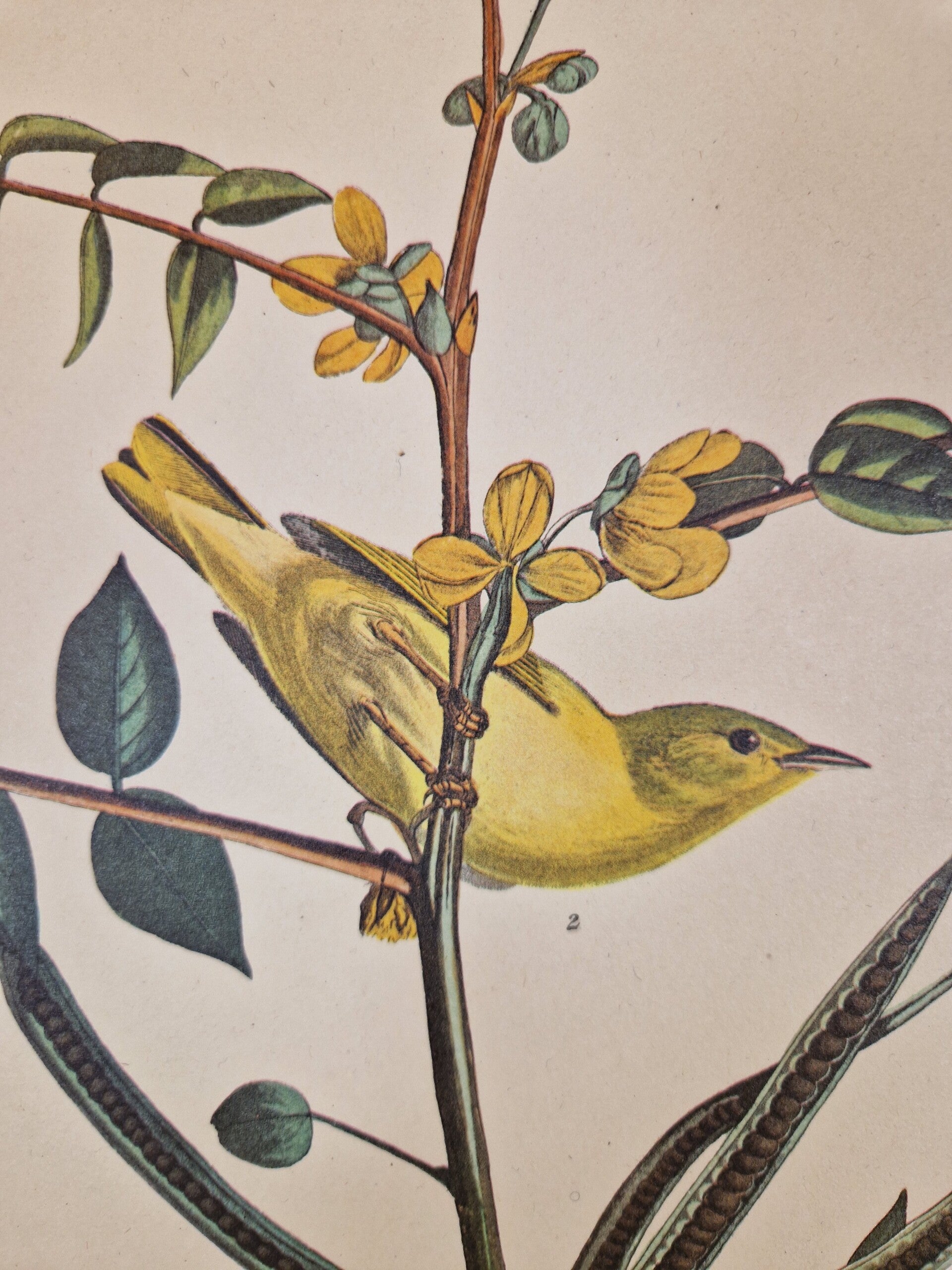 Dit is een authentieke lithografie van de Amsterdamse editie van The Birds of America van John James Audubon. In zijn monumentale meesterwerk, namelijk de Double Elephant Folio Edition van de Birds of America, gepubliceerd in de periode 1827-1838, publiceerde de natuuronderzoeker John James Audubon 435 tekeningen van de vogels die hij tekende op basis van zijn observaties in de natuur. Deze afbeeldingen werden gepubliceerd als handgekleurde gravures met aquatint en ets door Robert Havell, Jr. in Engeland. In 1971 besloten de Johnson Reprint Corporation in New York en de Amsterdamse firma Theatrum Orbis Terrarum Ltd om een zo goed mogelijke facsimile van dit meesterwerk te produceren. In 1971 en 1972 publiceerden deze twee firma's slechts 250 exemplaren van de volledige 435 platen van de originele Robert Havell's kopie van de Double Elephant Folio met behulp van kleurenfotolithografie (deze afdrukken vertonen dus het karakteristieke puntmatrixpatroon van offsetlithografie bij onderzoek met een 10x of 15x vergrotingsloep). Deze prenten staan bekend als de Amsterdam Edition van het Double Elephant-folio en zijn daarmee de eerste volledige facsimile van het originele monumentale werk van Audubon. Om de textuur van het originele J Whatman-papier dat in de originele Havell-editie werd gebruikt, te reproduceren, werd voor de Amsterdamse editie het beroemde papierbedrijf G. Schut & Zonen gebruikt om speciaal 100% katoenen voddenpapier van museumkwaliteit te produceren voor het afdrukken van deze platen. Er werd slechts een beperkte set van 250 exemplaren van elk van de platen geproduceerd. De prenten van de Amsterdamse editie zijn te herkennen aan het unieke watermerk "G. Schut & Zonen (R) Audubon" langs de lange rand. De volledige vellen meten ongeveer 73 x 103 cm en de wat kleinere 48 x 68 cm. Ingelijst zijn ze een sieraad aan de muur. We hebben 100 fullsize verschillende vogels en 70 op het kleinere formaat. In de winkel zijn ze allemaal te bewonderen.