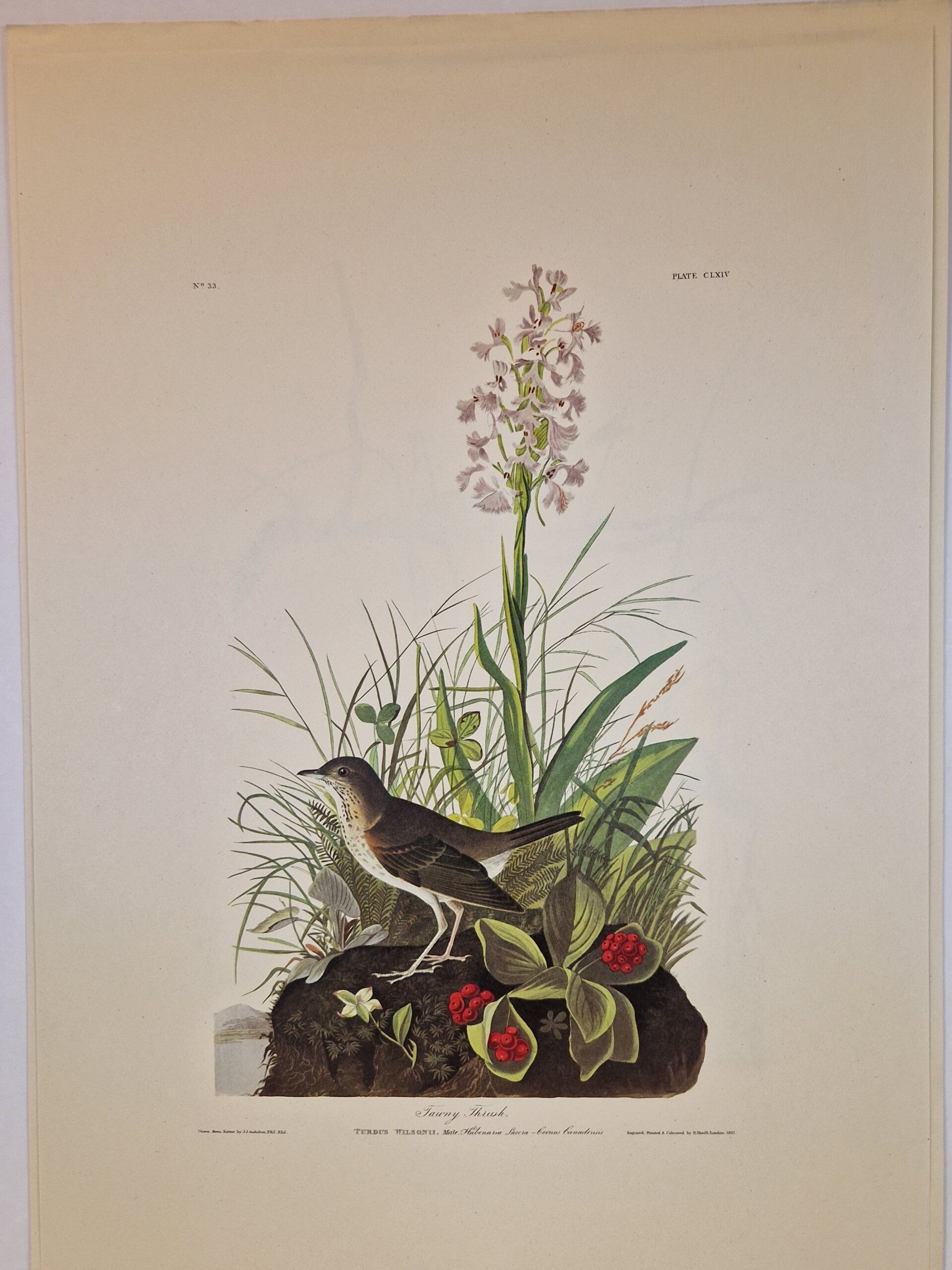 Dit is een authentieke lithografie van de Amsterdamse editie van The Birds of America van John James Audubon. In zijn monumentale meesterwerk, namelijk de Double Elephant Folio Edition van de Birds of America, gepubliceerd in de periode 1827-1838, publiceerde de natuuronderzoeker John James Audubon 435 tekeningen van de vogels die hij tekende op basis van zijn observaties in de natuur. Deze afbeeldingen werden gepubliceerd als handgekleurde gravures met aquatint en ets door Robert Havell, Jr. in Engeland. In 1971 besloten de Johnson Reprint Corporation in New York en de Amsterdamse firma Theatrum Orbis Terrarum Ltd om een zo goed mogelijke facsimile van dit meesterwerk te produceren. In 1971 en 1972 publiceerden deze twee firma's slechts 250 exemplaren van de volledige 435 platen van de originele Robert Havell's kopie van de Double Elephant Folio met behulp van kleurenfotolithografie (deze afdrukken vertonen dus het karakteristieke puntmatrixpatroon van offsetlithografie bij onderzoek met een 10x of 15x vergrotingsloep). Deze prenten staan bekend als de Amsterdam Edition van het Double Elephant-folio en zijn daarmee de eerste volledige facsimile van het originele monumentale werk van Audubon. Om de textuur van het originele J Whatman-papier dat in de originele Havell-editie werd gebruikt, te reproduceren, werd voor de Amsterdamse editie het beroemde papierbedrijf G. Schut & Zonen gebruikt om speciaal 100% katoenen voddenpapier van museumkwaliteit te produceren voor het afdrukken van deze platen. Er werd slechts een beperkte set van 250 exemplaren van elk van de platen geproduceerd. De prenten van de Amsterdamse editie zijn te herkennen aan het unieke watermerk "G. Schut & Zonen (R) Audubon" langs de lange rand. De volledige vellen meten ongeveer 73 x 103 cm en de wat kleinere 48 x 68 cm. Ingelijst zijn ze een sieraad aan de muur. We hebben 100 fullsize verschillende vogels en 70 op het kleinere formaat. In de winkel zijn ze allemaal te bewonderen.