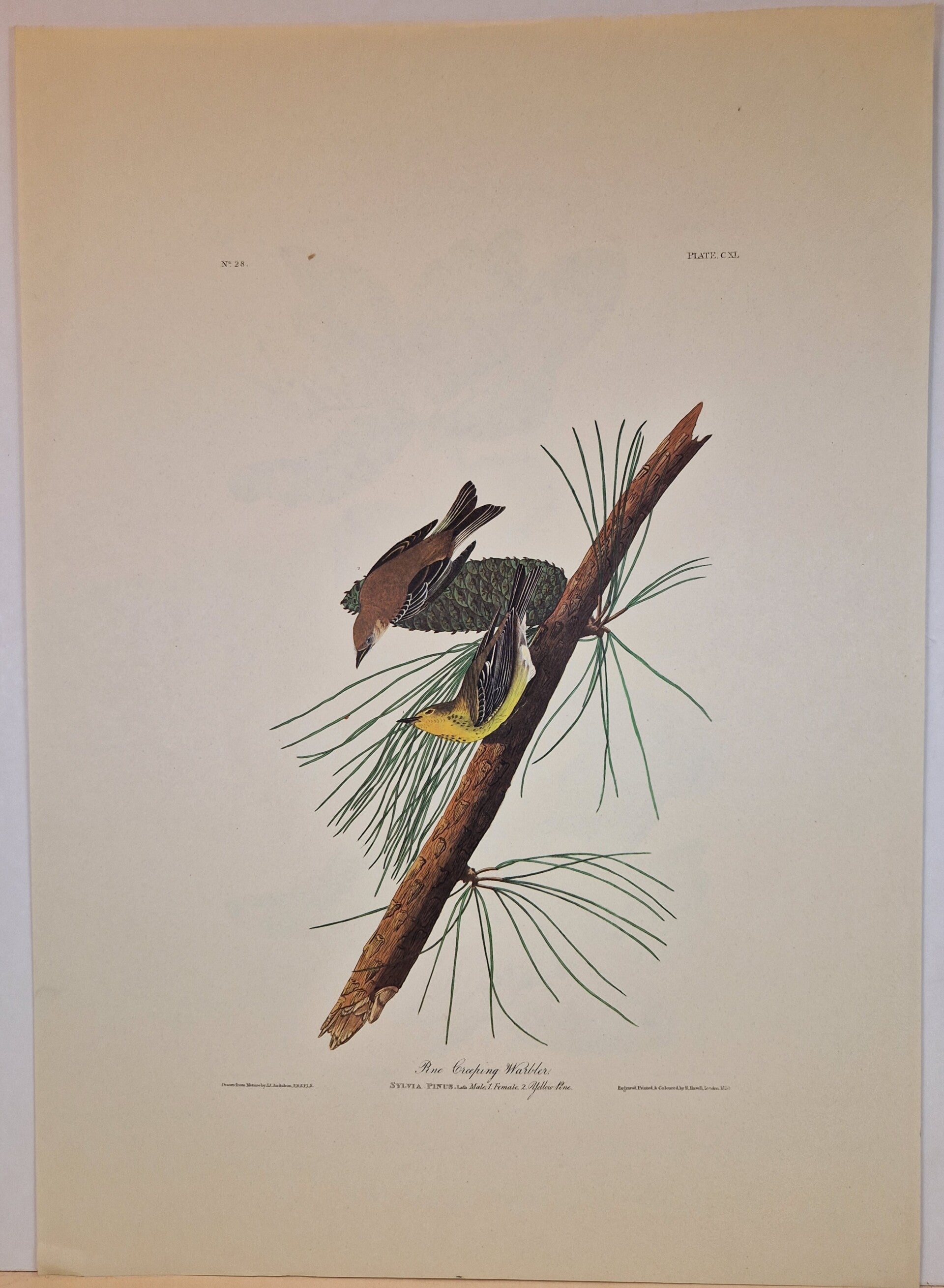 Dit is een authentieke lithografie van de Amsterdamse editie van The Birds of America van John James Audubon. In zijn monumentale meesterwerk, namelijk de Double Elephant Folio Edition van de Birds of America, gepubliceerd in de periode 1827-1838, publiceerde de natuuronderzoeker John James Audubon 435 tekeningen van de vogels die hij tekende op basis van zijn observaties in de natuur. Deze afbeeldingen werden gepubliceerd als handgekleurde gravures met aquatint en ets door Robert Havell, Jr. in Engeland. In 1971 besloten de Johnson Reprint Corporation in New York en de Amsterdamse firma Theatrum Orbis Terrarum Ltd om een zo goed mogelijke facsimile van dit meesterwerk te produceren. In 1971 en 1972 publiceerden deze twee firma's slechts 250 exemplaren van de volledige 435 platen van de originele Robert Havell's kopie van de Double Elephant Folio met behulp van kleurenfotolithografie (deze afdrukken vertonen dus het karakteristieke puntmatrixpatroon van offsetlithografie bij onderzoek met een 10x of 15x vergrotingsloep). Deze prenten staan bekend als de Amsterdam Edition van het Double Elephant-folio en zijn daarmee de eerste volledige facsimile van het originele monumentale werk van Audubon. Om de textuur van het originele J Whatman-papier dat in de originele Havell-editie werd gebruikt, te reproduceren, werd voor de Amsterdamse editie het beroemde papierbedrijf G. Schut & Zonen gebruikt om speciaal 100% katoenen voddenpapier van museumkwaliteit te produceren voor het afdrukken van deze platen. Er werd slechts een beperkte set van 250 exemplaren van elk van de platen geproduceerd. De prenten van de Amsterdamse editie zijn te herkennen aan het unieke watermerk "G. Schut & Zonen (R) Audubon" langs de lange rand. De volledige vellen meten ongeveer 73 x 103 cm en de wat kleinere 48 x 68 cm. Ingelijst zijn ze een sieraad aan de muur. We hebben 100 fullsize verschillende vogels en 70 op het kleinere formaat. In de winkel zijn ze allemaal te bewonderen.