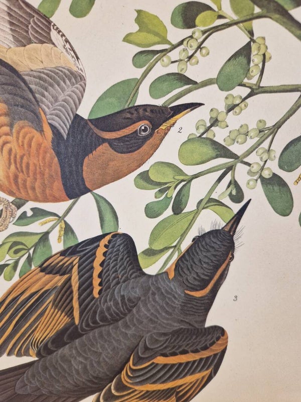 Dit is een authentieke lithografie van de Amsterdamse editie van The Birds of America van John James Audubon. In zijn monumentale meesterwerk, namelijk de Double Elephant Folio Edition van de Birds of America, gepubliceerd in de periode 1827-1838, publiceerde de natuuronderzoeker John James Audubon 435 tekeningen van de vogels die hij tekende op basis van zijn observaties in de natuur. Deze afbeeldingen werden gepubliceerd als handgekleurde gravures met aquatint en ets door Robert Havell, Jr. in Engeland. In 1971 besloten de Johnson Reprint Corporation in New York en de Amsterdamse firma Theatrum Orbis Terrarum Ltd om een zo goed mogelijke facsimile van dit meesterwerk te produceren. In 1971 en 1972 publiceerden deze twee firma's slechts 250 exemplaren van de volledige 435 platen van de originele Robert Havell's kopie van de Double Elephant Folio met behulp van kleurenfotolithografie (deze afdrukken vertonen dus het karakteristieke puntmatrixpatroon van offsetlithografie bij onderzoek met een 10x of 15x vergrotingsloep). Deze prenten staan bekend als de Amsterdam Edition van het Double Elephant-folio en zijn daarmee de eerste volledige facsimile van het originele monumentale werk van Audubon. Om de textuur van het originele J Whatman-papier dat in de originele Havell-editie werd gebruikt, te reproduceren, werd voor de Amsterdamse editie het beroemde papierbedrijf G. Schut & Zonen gebruikt om speciaal 100% katoenen voddenpapier van museumkwaliteit te produceren voor het afdrukken van deze platen. Er werd slechts een beperkte set van 250 exemplaren van elk van de platen geproduceerd. De prenten van de Amsterdamse editie zijn te herkennen aan het unieke watermerk "G. Schut & Zonen (R) Audubon" langs de lange rand. De volledige vellen meten ongeveer 73 x 103 cm en de wat kleinere 48 x 68 cm. Ingelijst zijn ze een sieraad aan de muur. We hebben 100 fullsize verschillende vogels en 70 op het kleinere formaat. In de winkel zijn ze allemaal te bewonderen.