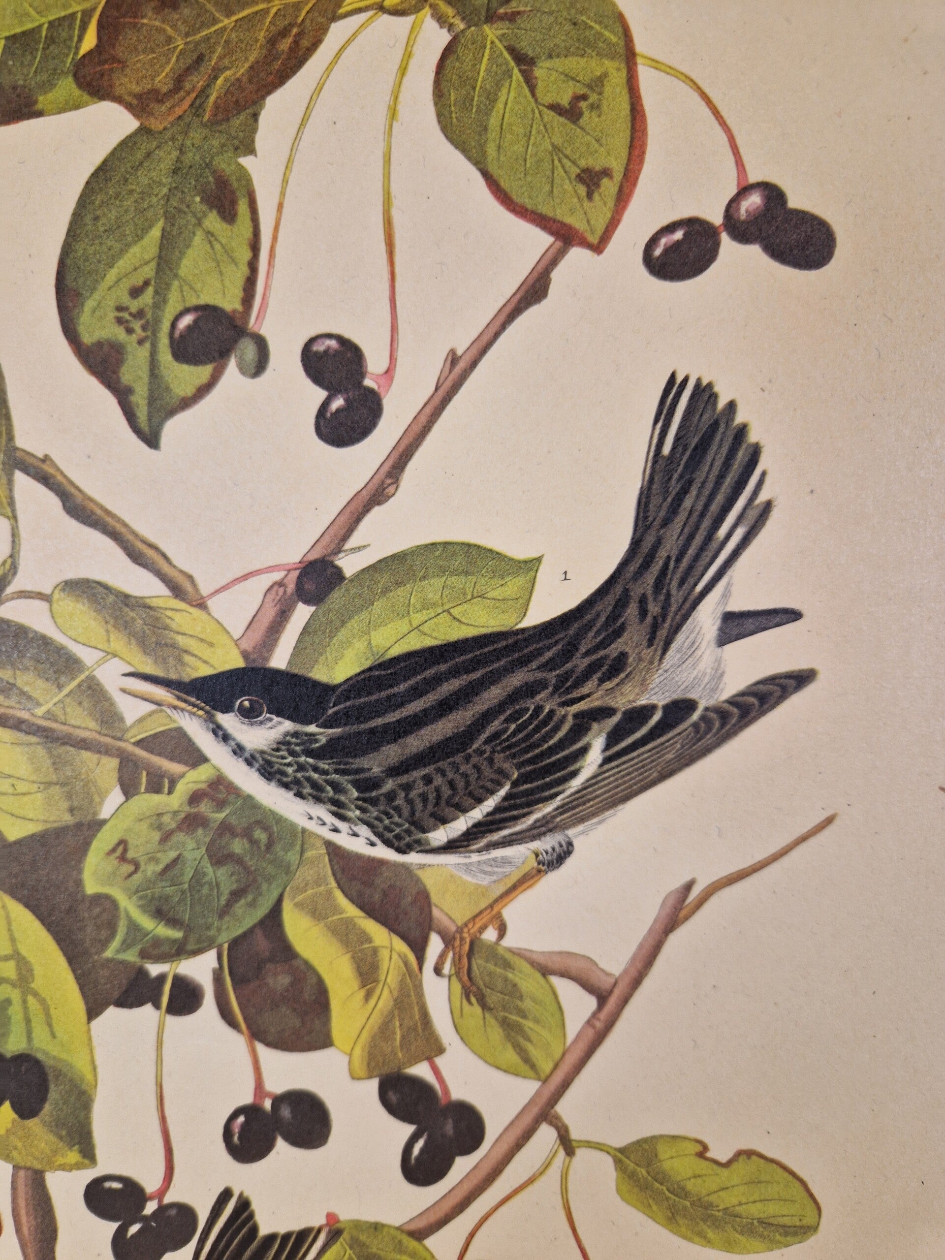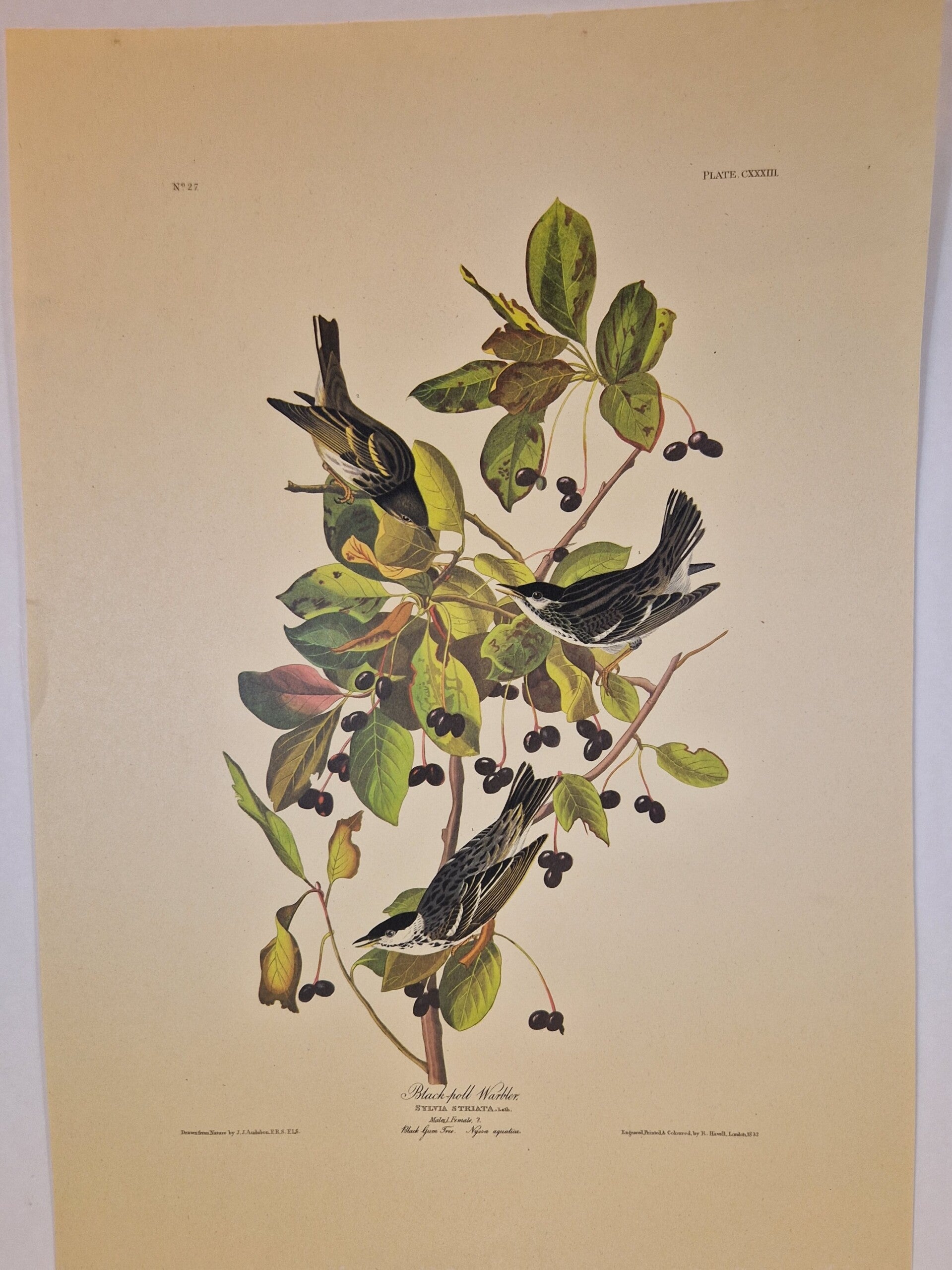Dit is een authentieke lithografie van de Amsterdamse editie van The Birds of America van John James Audubon. In zijn monumentale meesterwerk, namelijk de Double Elephant Folio Edition van de Birds of America, gepubliceerd in de periode 1827-1838, publiceerde de natuuronderzoeker John James Audubon 435 tekeningen van de vogels die hij tekende op basis van zijn observaties in de natuur. Deze afbeeldingen werden gepubliceerd als handgekleurde gravures met aquatint en ets door Robert Havell, Jr. in Engeland. In 1971 besloten de Johnson Reprint Corporation in New York en de Amsterdamse firma Theatrum Orbis Terrarum Ltd om een zo goed mogelijke facsimile van dit meesterwerk te produceren. In 1971 en 1972 publiceerden deze twee firma's slechts 250 exemplaren van de volledige 435 platen van de originele Robert Havell's kopie van de Double Elephant Folio met behulp van kleurenfotolithografie (deze afdrukken vertonen dus het karakteristieke puntmatrixpatroon van offsetlithografie bij onderzoek met een 10x of 15x vergrotingsloep). Deze prenten staan bekend als de Amsterdam Edition van het Double Elephant-folio en zijn daarmee de eerste volledige facsimile van het originele monumentale werk van Audubon. Om de textuur van het originele J Whatman-papier dat in de originele Havell-editie werd gebruikt, te reproduceren, werd voor de Amsterdamse editie het beroemde papierbedrijf G. Schut & Zonen gebruikt om speciaal 100% katoenen voddenpapier van museumkwaliteit te produceren voor het afdrukken van deze platen. Er werd slechts een beperkte set van 250 exemplaren van elk van de platen geproduceerd. De prenten van de Amsterdamse editie zijn te herkennen aan het unieke watermerk "G. Schut & Zonen (R) Audubon" langs de lange rand. De volledige vellen meten ongeveer 73 x 103 cm en de wat kleinere 48 x 68 cm. Ingelijst zijn ze een sieraad aan de muur. We hebben 100 fullsize verschillende vogels en 70 op het kleinere formaat. In de winkel zijn ze allemaal te bewonderen.