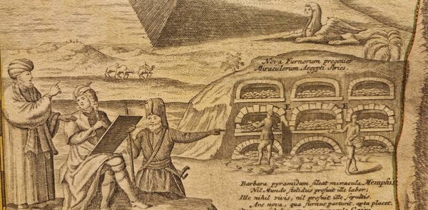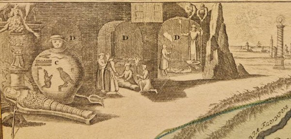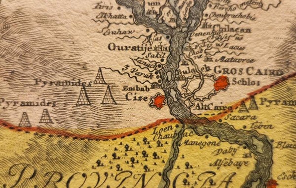 Homanns kaart van Egypte is gericht op de Nijlvallei van de Middellandse Zee tot onder de eerste cataract aan de samenvloeiing van de Witte en Blauwe Nijl. Bijna een derde van de kaart is gegraveerd met fascinerende scènes van de cataract, de Sfinx, piramides, diverse antiquiteiten, scènes van balsemen en oude ovens.