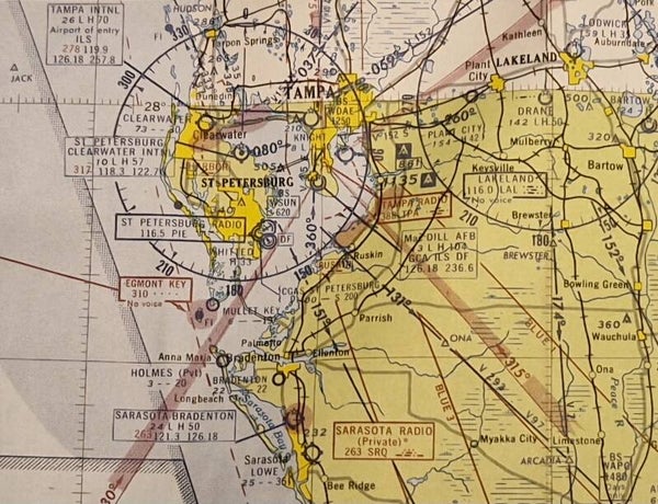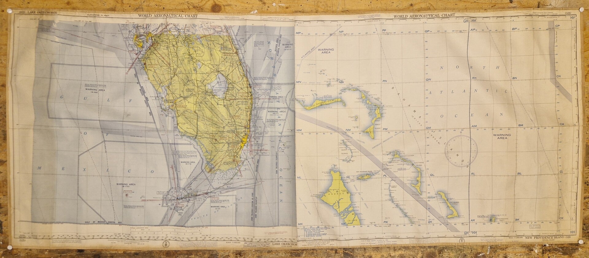Deze twee opeenvolgende kaarten geven de punt van Florida en de Key's weer en de Bahama's. Er staat veel info op voor de vliegenier. De maat is 134 x 55 cm. De kaart is voor het laatst gecorrigeerd in 1959.