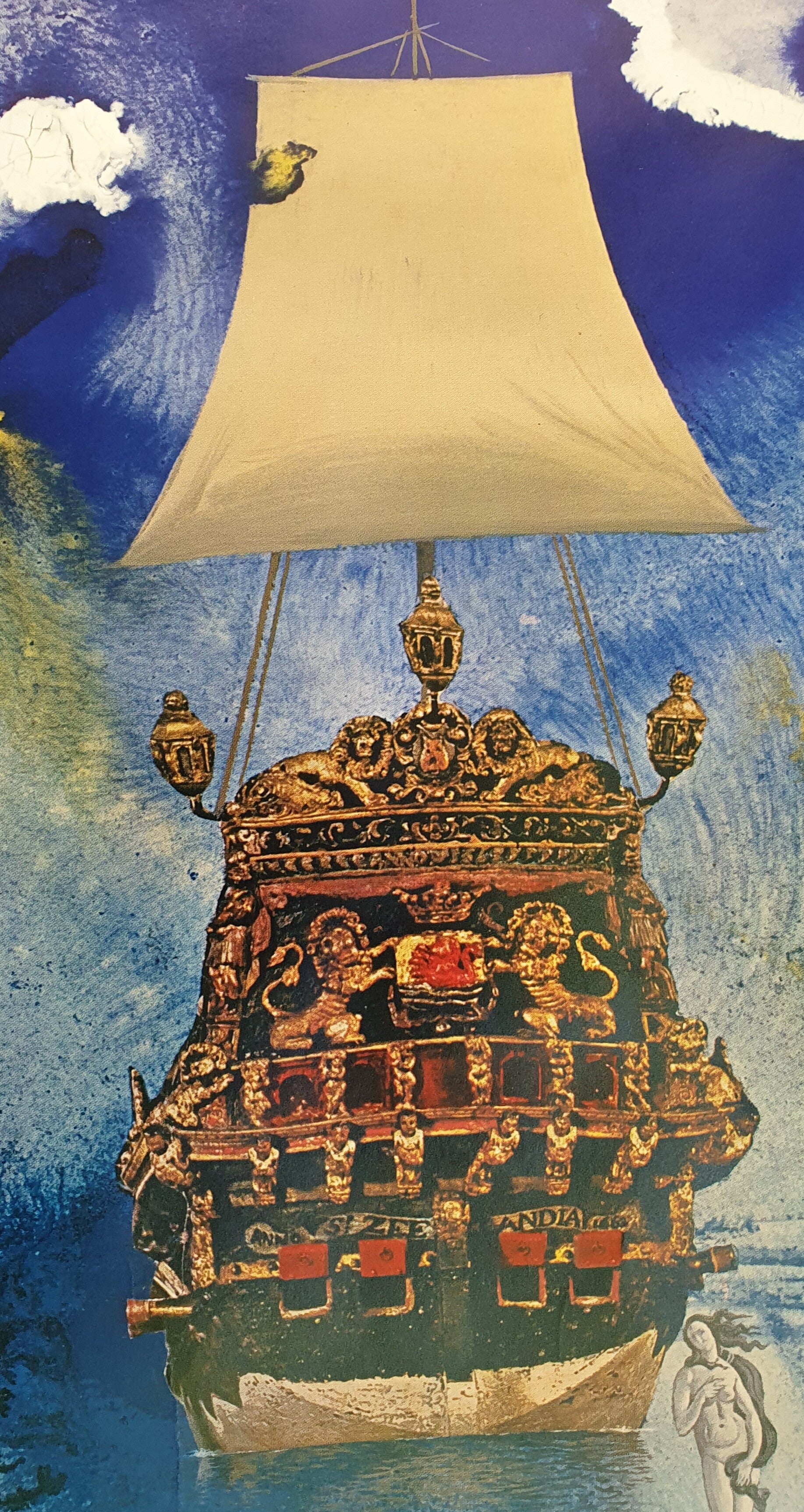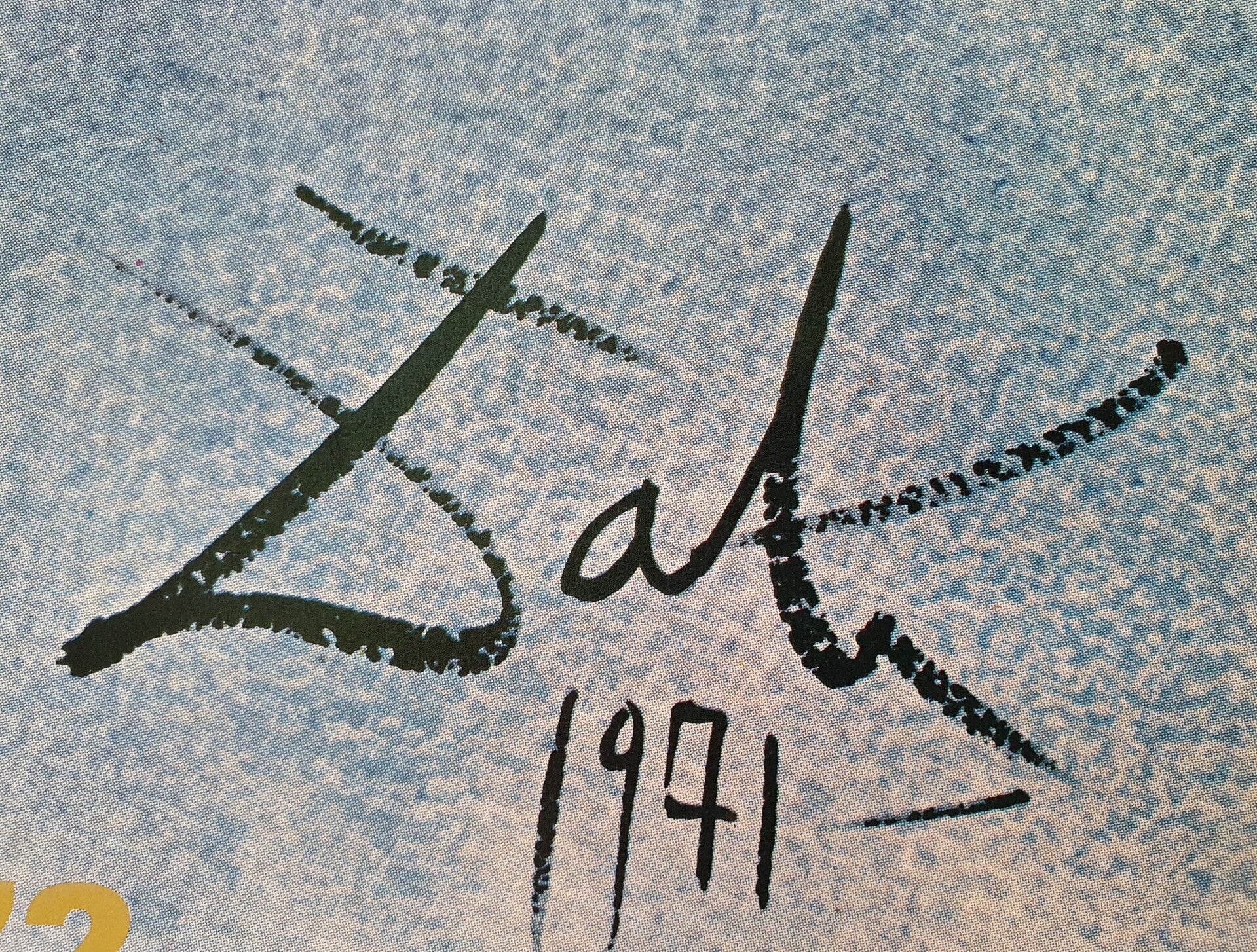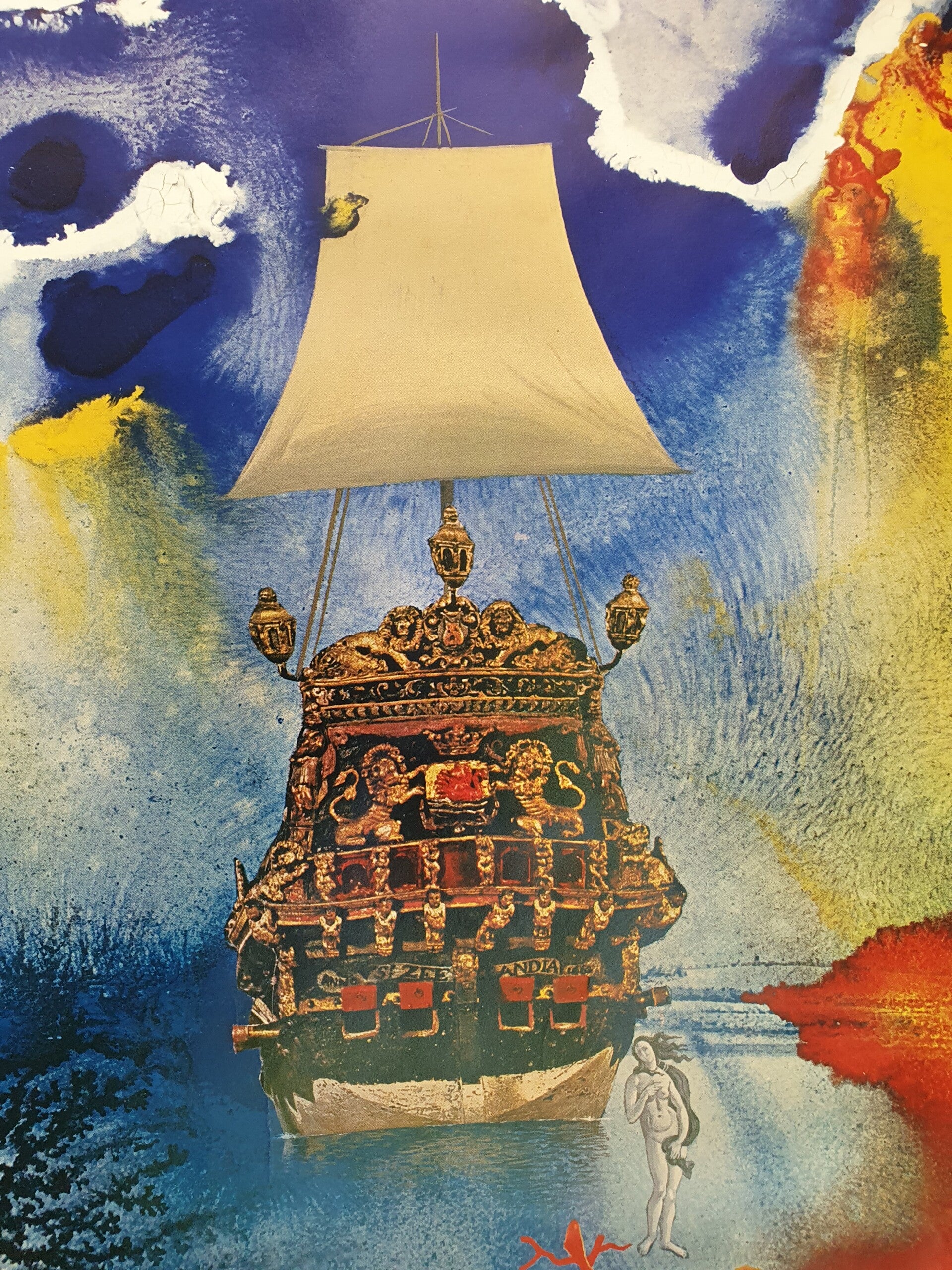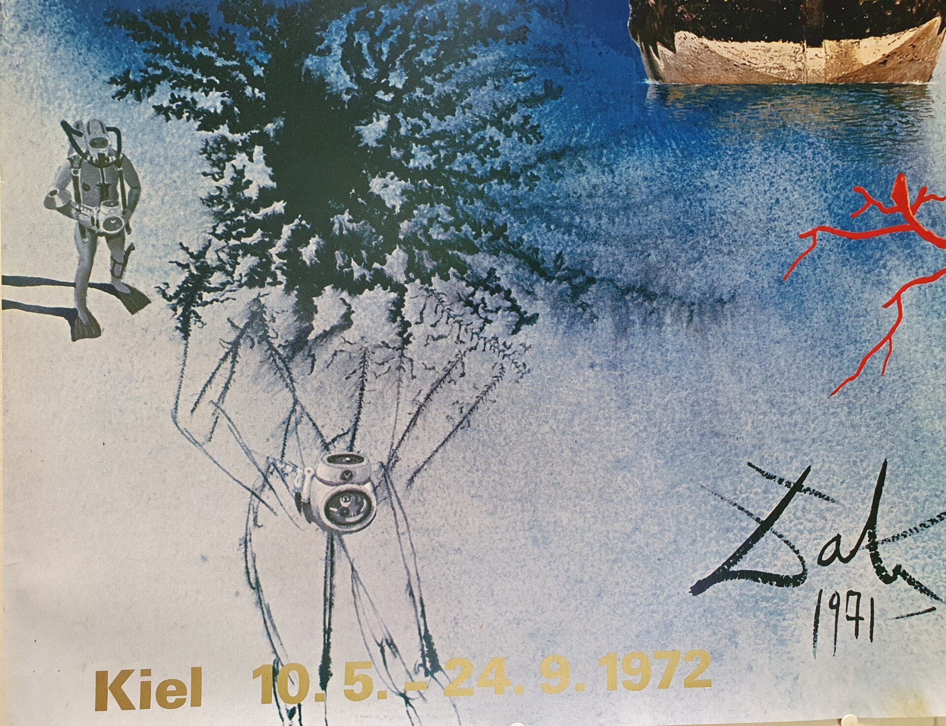 Salvador Dali was geboren in 1904 en overleden in 1989. Hij staat bekend om zijn flamboyante kunst. Deze affiche is gemaakt voor de Olympische Spelen van Kiel in 1972 met het motief " Mensen en de zee".
