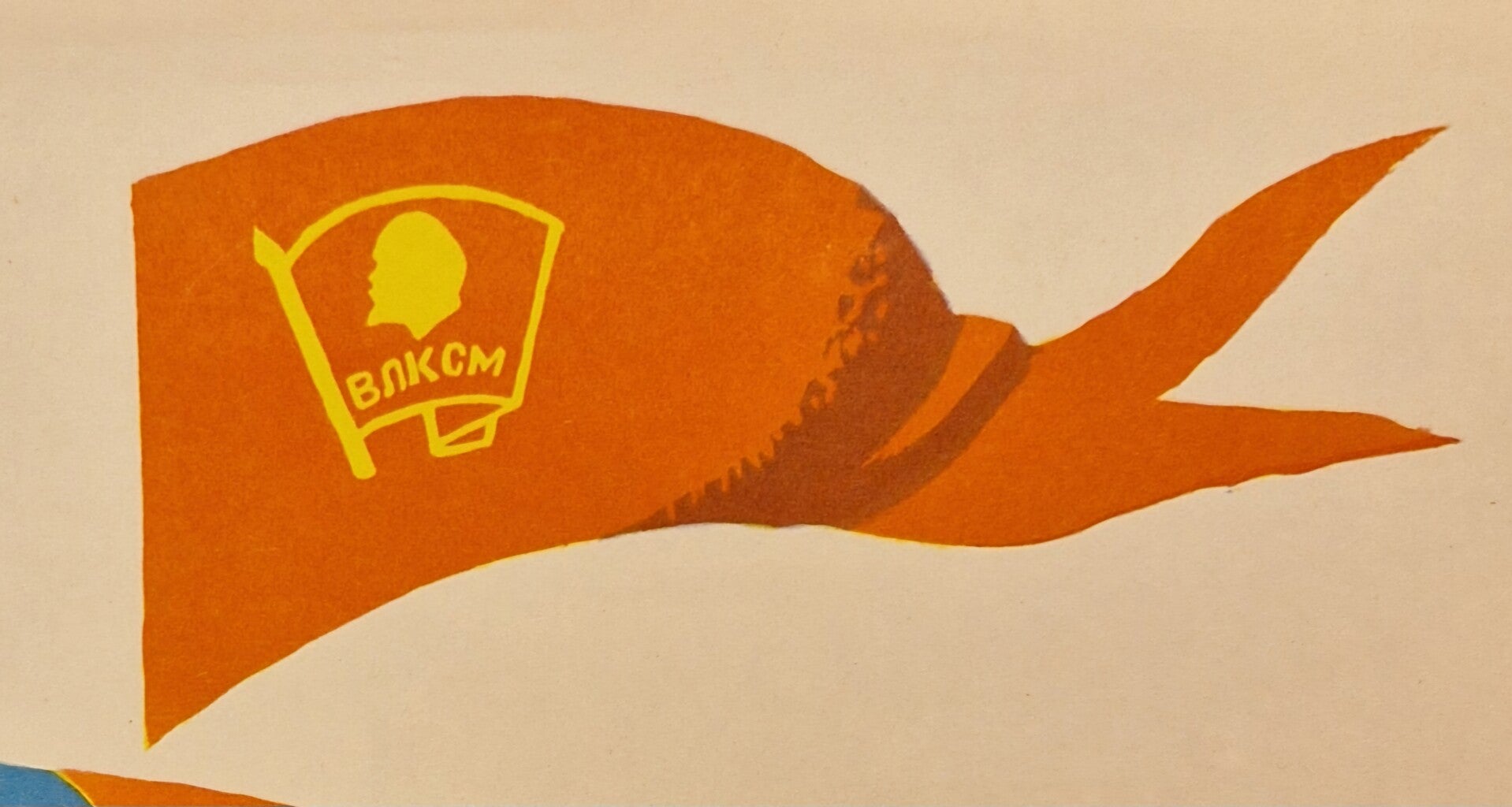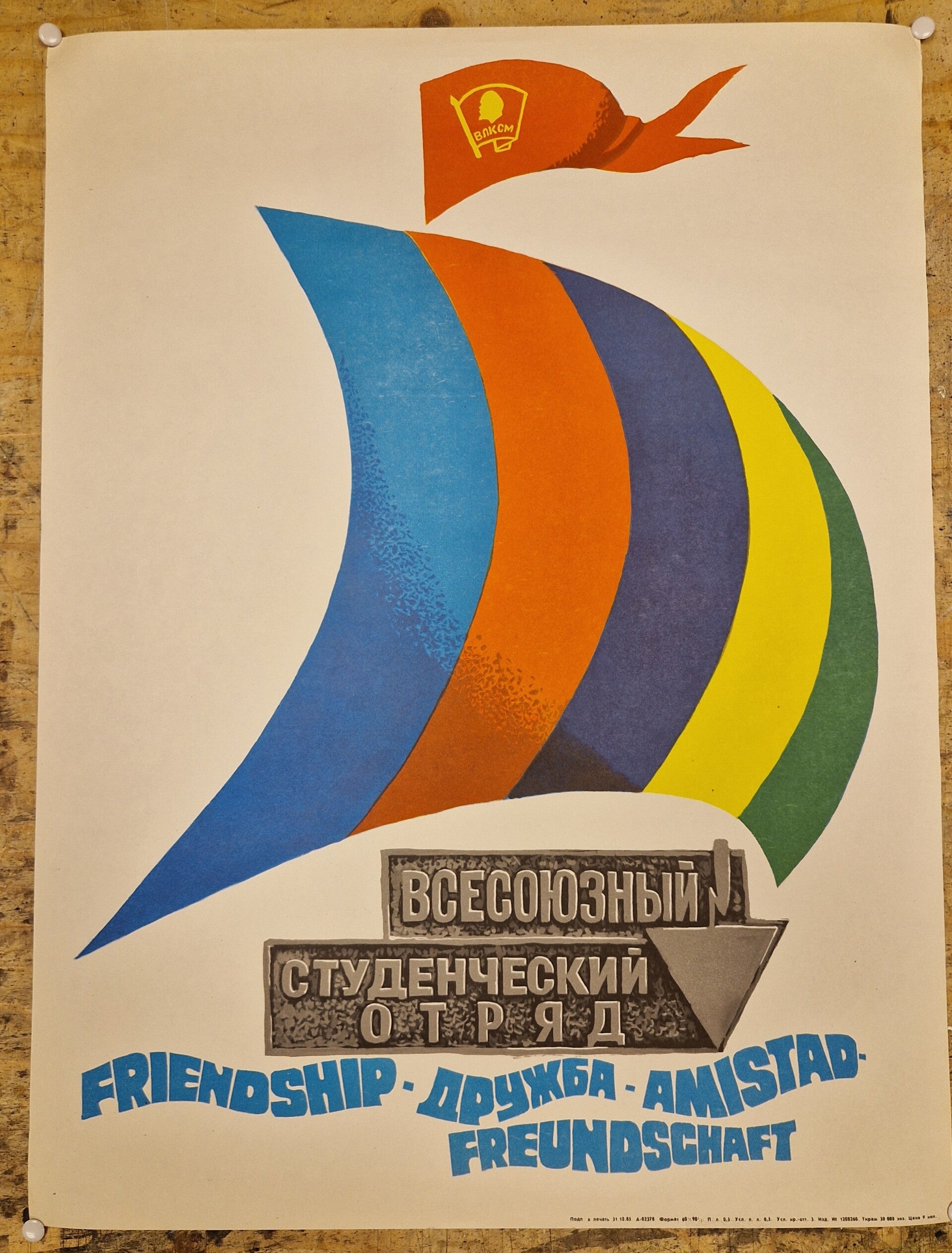 Dit is een propaganda poster van de Komosol. Aan de onderkant in 4 talen het woord vriendschap en in het midden de woorden All- Unie en Studenten- ploeg. Aan de bovenkant het woord Komosol.