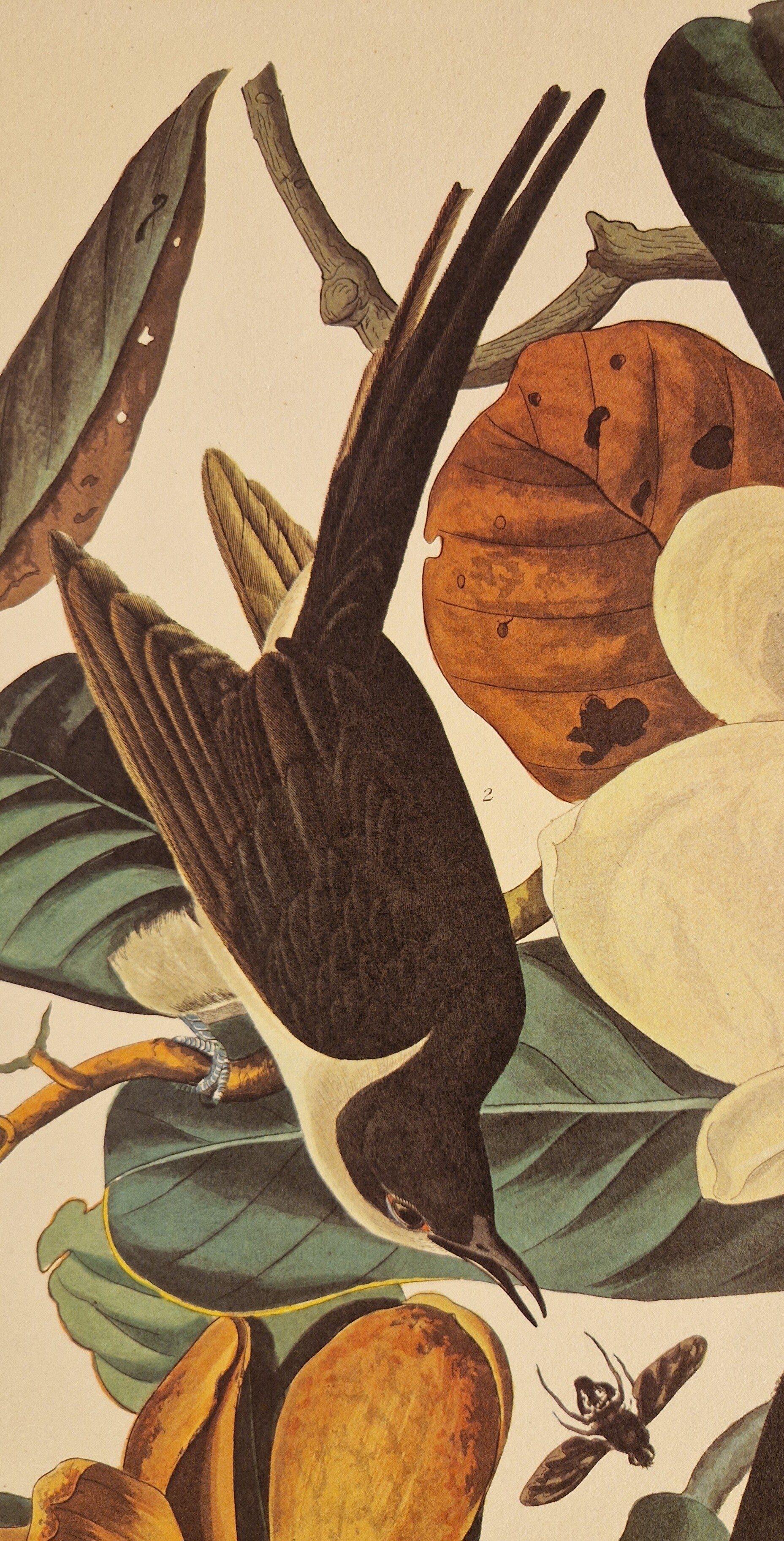 Dit is een authentieke lithografie van de Amsterdamse editie van The Birds of America van John James Audubon. In zijn monumentale meesterwerk, namelijk de Double Elephant Folio Edition van de Birds of America, gepubliceerd in de periode 1827-1838, publiceerde de natuuronderzoeker John James Audubon 435 tekeningen van de vogels die hij tekende op basis van zijn observaties in de natuur. Deze afbeeldingen werden gepubliceerd als handgekleurde gravures met aquatint en ets door Robert Havell, Jr. in Engeland. In 1971 besloten de Johnson Reprint Corporation in New York en de Amsterdamse firma Theatrum Orbis Terrarum Ltd om een zo goed mogelijke facsimile van dit meesterwerk te produceren. In 1971 en 1972 publiceerden deze twee firma's slechts 250 exemplaren van de volledige 435 platen van de originele Robert Havell's kopie van de Double Elephant Folio met behulp van kleurenfotolithografie (deze afdrukken vertonen dus het karakteristieke puntmatrixpatroon van offsetlithografie bij onderzoek met een 10x of 15x vergrotingsloep). Deze prenten staan bekend als de Amsterdam Edition van het Double Elephant-folio en zijn daarmee de eerste volledige facsimile van het originele monumentale werk van Audubon. Om de textuur van het originele J Whatman-papier dat in de originele Havell-editie werd gebruikt, te reproduceren, werd voor de Amsterdamse editie het beroemde papierbedrijf G. Schut & Zonen gebruikt om speciaal 100% katoenen voddenpapier van museumkwaliteit te produceren voor het afdrukken van deze platen. Er werd slechts een beperkte set van 250 exemplaren van elk van de platen geproduceerd. De prenten van de Amsterdamse editie zijn te herkennen aan het unieke watermerk "G. Schut & Zonen (R) Audubon" langs de lange rand. De volledige vellen meten ongeveer 73 x 103 cm en de wat kleinere 48 x 68 cm. Ingelijst zijn ze een sieraad aan de muur. We hebben 100 fullsize verschillende vogels en 70 op het kleinere formaat. In de winkel zijn ze allemaal te bewonderen.