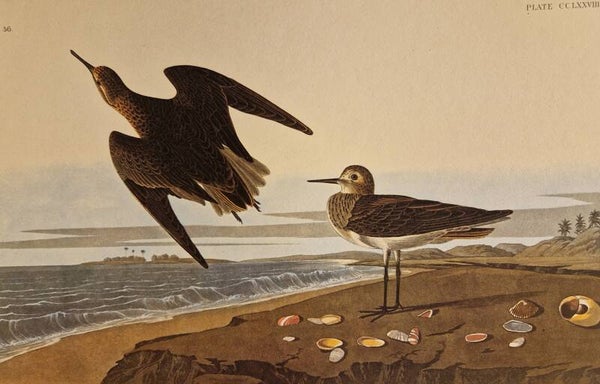 Dit is een authentieke lithografie van de Amsterdamse editie van The Birds of America van John James Audubon. In zijn monumentale meesterwerk, namelijk de Double Elephant Folio Edition van de Birds of America, gepubliceerd in de periode 1827-1838, publiceerde de natuuronderzoeker John James Audubon 435 tekeningen van de vogels die hij tekende op basis van zijn observaties in de natuur. Deze afbeeldingen werden gepubliceerd als handgekleurde gravures met aquatint en ets door Robert Havell, Jr. in Engeland. In 1971 besloten de Johnson Reprint Corporation in New York en de Amsterdamse firma Theatrum Orbis Terrarum Ltd om een zo goed mogelijke facsimile van dit meesterwerk te produceren. In 1971 en 1972 publiceerden deze twee firma's slechts 250 exemplaren van de volledige 435 platen van de originele Robert Havell's kopie van de Double Elephant Folio met behulp van kleurenfotolithografie (deze afdrukken vertonen dus het karakteristieke puntmatrixpatroon van offsetlithografie bij onderzoek met een 10x of 15x vergrotingsloep). Deze prenten staan bekend als de Amsterdam Edition van het Double Elephant-folio en zijn daarmee de eerste volledige facsimile van het originele monumentale werk van Audubon. Om de textuur van het originele J Whatman-papier dat in de originele Havell-editie werd gebruikt, te reproduceren, werd voor de Amsterdamse editie het beroemde papierbedrijf G. Schut & Zonen gebruikt om speciaal 100% katoenen voddenpapier van museumkwaliteit te produceren voor het afdrukken van deze platen. Er werd slechts een beperkte set van 250 exemplaren van elk van de platen geproduceerd. De prenten van de Amsterdamse editie zijn te herkennen aan het unieke watermerk "G. Schut & Zonen (R) Audubon" langs de lange rand. De volledige vellen meten ongeveer 73 x 103 cm en de wat kleinere 48 x 68 cm. Ingelijst zijn ze een sieraad aan de muur. We hebben 100 fullsize verschillende vogels en 70 op het kleinere formaat. In de winkel zijn ze allemaal te bewonderen.
