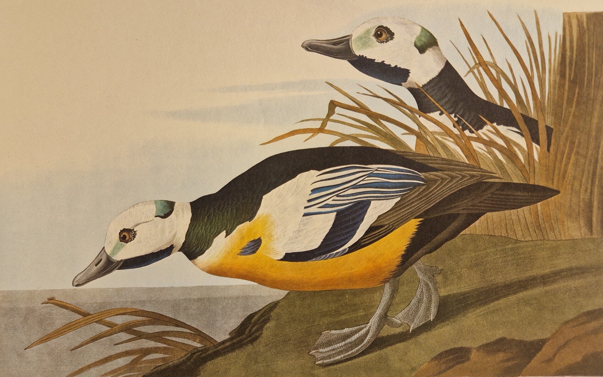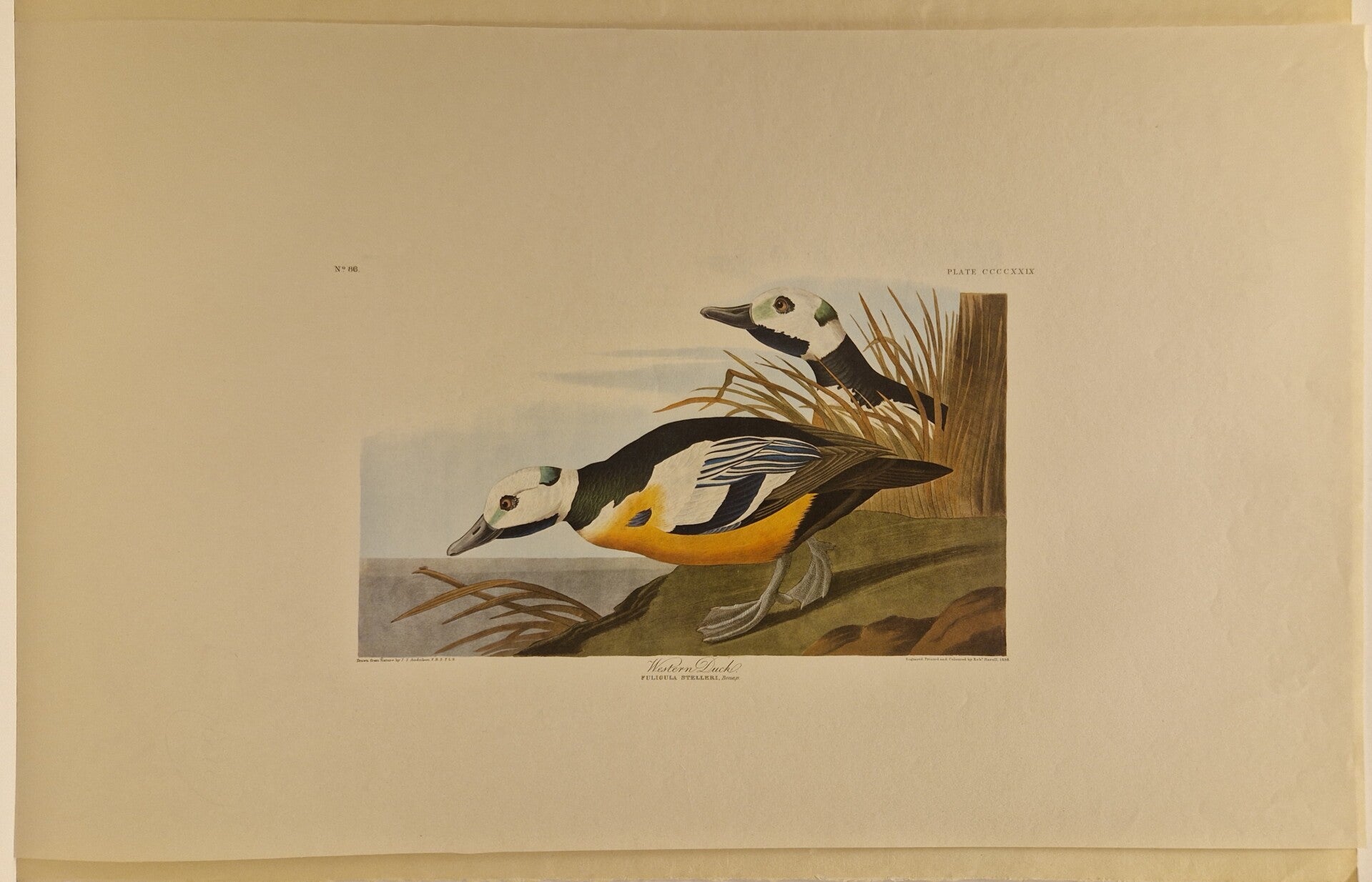 Dit is een authentieke lithografie van de Amsterdamse editie van The Birds of America van John James Audubon. In zijn monumentale meesterwerk, namelijk de Double Elephant Folio Edition van de Birds of America, gepubliceerd in de periode 1827-1838, publiceerde de natuuronderzoeker John James Audubon 435 tekeningen van de vogels die hij tekende op basis van zijn observaties in de natuur. Deze afbeeldingen werden gepubliceerd als handgekleurde gravures met aquatint en ets door Robert Havell, Jr. in Engeland. In 1971 besloten de Johnson Reprint Corporation in New York en de Amsterdamse firma Theatrum Orbis Terrarum Ltd om een zo goed mogelijke facsimile van dit meesterwerk te produceren. In 1971 en 1972 publiceerden deze twee firma's slechts 250 exemplaren van de volledige 435 platen van de originele Robert Havell's kopie van de Double Elephant Folio met behulp van kleurenfotolithografie (deze afdrukken vertonen dus het karakteristieke puntmatrixpatroon van offsetlithografie bij onderzoek met een 10x of 15x vergrotingsloep). Deze prenten staan bekend als de Amsterdam Edition van het Double Elephant-folio en zijn daarmee de eerste volledige facsimile van het originele monumentale werk van Audubon. Om de textuur van het originele J Whatman-papier dat in de originele Havell-editie werd gebruikt, te reproduceren, werd voor de Amsterdamse editie het beroemde papierbedrijf G. Schut & Zonen gebruikt om speciaal 100% katoenen voddenpapier van museumkwaliteit te produceren voor het afdrukken van deze platen. Er werd slechts een beperkte set van 250 exemplaren van elk van de platen geproduceerd. De prenten van de Amsterdamse editie zijn te herkennen aan het unieke watermerk "G. Schut & Zonen (R) Audubon" langs de lange rand. De volledige vellen meten ongeveer 73 x 103 cm en de wat kleinere 48 x 68 cm. Ingelijst zijn ze een sieraad aan de muur. We hebben 100 fullsize verschillende vogels en 70 op het kleinere formaat. In de winkel zijn ze allemaal te bewonderen.