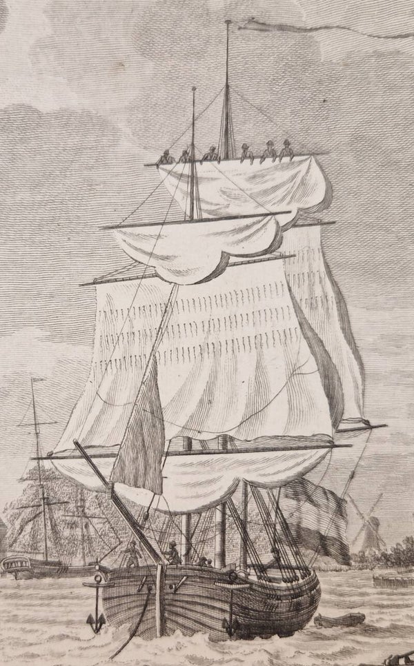 Antieke prent van Dordrecht. Tweetalige titel onder de afbeelding. Onder de titel: Te Amsterdam door P. YVER, J. SMIT en Zoon, en F.W. GRIJS. Kopergravure van Mattheus Sallieth, uitgegeven te Amsterdam in 1802 door J. Allart in "Atlas van alle de zee-havens der Bataafsche Republiek." Tekenaar: Dirk de Jong, 1781. Afmetingen blad 45 x 35 en afbeelding 26 x 34 cm.