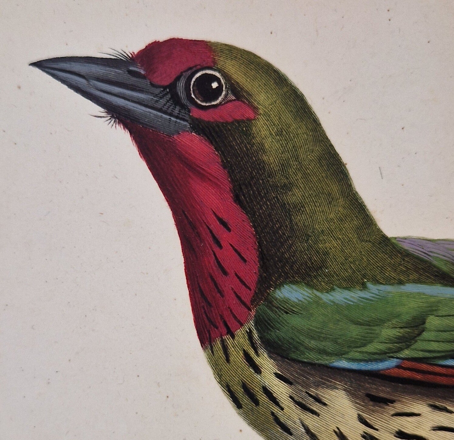 Hij maakte illustraties van insecten voor de Franse natuuronderzoeker Sonnini en illustreerde een boek van Fournier over Egypte. Vervolgens maakte hij tussen 1801 en 1804 in opdracht van Napoleon Bonaparte een serie aquarellen van vogels en bloemen. Tot zijn bekendste werken behoren de werken die hij maakte ter illustratie van de wetenschappelijke studies van François Le Vaillant over papegaaien (perroquets), paradijsvogels (oiseaux de paradis), scharrelaars (rolliers), toekans (toucans), baardvogels (barbus), suikervogels (promerops), bijeneters (guêpiers), trogons (couroucous) en toerako's (touracos). Naast hun onmiskenbare schoonheid vertonen Barrabands gravures een wetenschappelijke nauwkeurigheid die weinig ornithologische kunstenaars sindsdien hebben geëvenaard. De minutieus met de hand ingekleurde gravures in de publicaties van Levaillant waren ongeëvenaard vanwege de delicate modulaties van toon en kleur, fijne lijnen en perfecte tekenkunst. Hierdoor waren ze uitzonderlijk rijk en gevarieerd in toon. Elke veer wordt omlijnd door tientallen parallelle lijnen, wat zorgt voor opmerkelijke details en een natuurlijk gekleurde textuur. Sommige prenten zijn versierd met een vleugje bladgoud op de veren van de wangen en schouders van de vogels. Dit benadrukt de kostbaarheid van de platen en geeft de iriserende glans van de veren van de vogels weer. Deze gravure is gemaakt tussen 1801-1806.