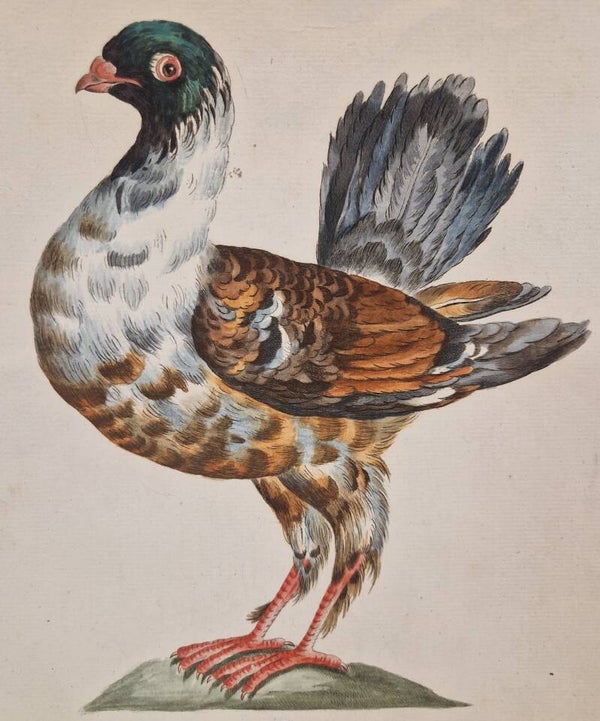 Deze 18e-eeuwse met de hand ingekleurde vogelgravure van een duif uit de Natural History of Birds van Saverio Manetti, gedrukt op geschept papier, getiteld, werd getekend en gegraveerd door Violante Vanni voor Saverio Manetti's (1724-1783) Storia Naturale degli Uccelli Trattata con Metodo e Adornata di Figure Intagliate in Rame e Miniate al Naturale, Natural History of the Birds Treated Systematically and Adorned with Copperplate Engraving Illustrations, in Miniature and Life-Size.