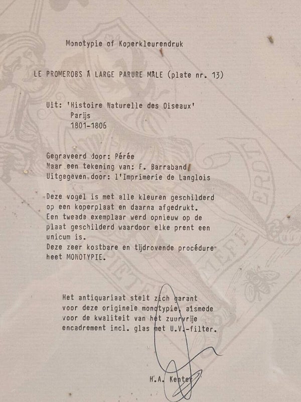 Hij maakte illustraties van insecten voor de Franse natuuronderzoeker Sonnini en illustreerde een boek van Fournier over Egypte. Vervolgens maakte hij tussen 1801 en 1804 in opdracht van Napoleon Bonaparte een serie aquarellen van vogels en bloemen. Tot zijn bekendste werken behoren de werken die hij maakte ter illustratie van de wetenschappelijke studies van François Le Vaillant over papegaaien (perroquets), paradijsvogels (oiseaux de paradis), scharrelaars (rolliers), toekans (toucans), baardvogels (barbus), suikervogels (promerops), bijeneters (guêpiers), trogons (couroucous) en toerako's (touracos). Naast hun onmiskenbare schoonheid vertonen Barrabands gravures een wetenschappelijke nauwkeurigheid die weinig ornithologische kunstenaars sindsdien hebben geëvenaard. De minutieus met de hand ingekleurde gravures in de publicaties van Levaillant waren ongeëvenaard vanwege de delicate modulaties van toon en kleur, fijne lijnen en perfecte tekenkunst. Hierdoor waren ze uitzonderlijk rijk en gevarieerd in toon. Elke veer wordt omlijnd door tientallen parallelle lijnen, wat zorgt voor opmerkelijke details en een natuurlijk gekleurde textuur. Sommige prenten zijn versierd met een vleugje bladgoud op de veren van de wangen en schouders van de vogels. Dit benadrukt de kostbaarheid van de platen en geeft de iriserende glans van de veren van de vogels weer. Deze gravure is gemaakt tussen 1801-1806.